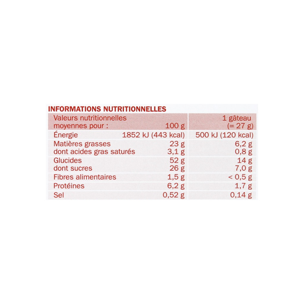 Oeufs ; farine de blé ; sucre ; huile de colza ; chocolat 7 % [sucre, pâte de cacao, beurre de cacao, émulsifiant : lécithines (soja), arôme naturel de vanille] ; stabilisant : glycérol ; sirop de glucose-fructose ; amidon de blé ; arômes (dont alcool) ; poudres à lever : E450, E500 ; sucre vanilliné (sucre, dextrose, amidon de maïs, arôme) ; sel.