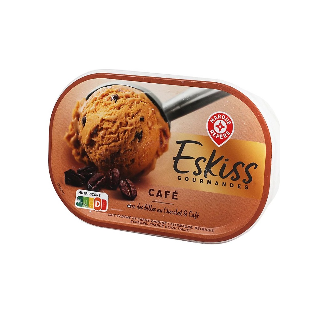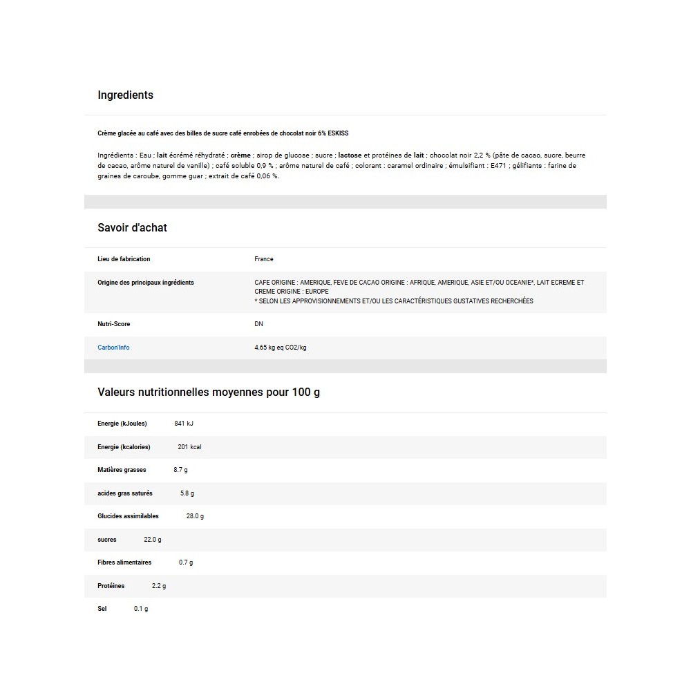 Ingrédients : Eau ; lait écrémé réhydraté ; crème ; sirop de glucose ; sucre ; lactose et protéines de lait ; chocolat noir 2,2 % (pâte de cacao, sucre, beurre de cacao, arôme naturel de vanille) ; café soluble 0,9 % ; arôme naturel de café ; colorant : caramel ordinaire ; émulsifiant : E471 ; gélifiants : farine de graines de caroube, gomme guar ; extrait de café 0,06 %.
