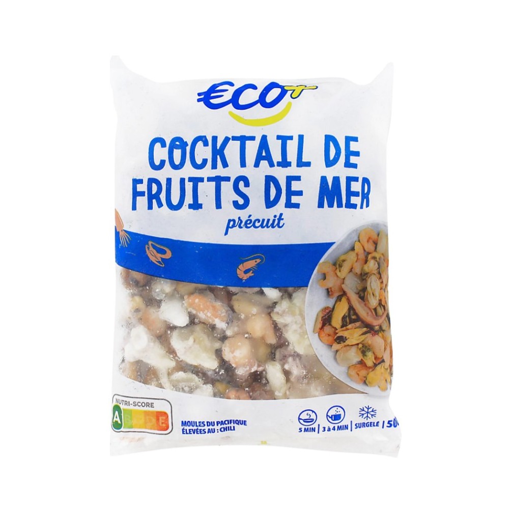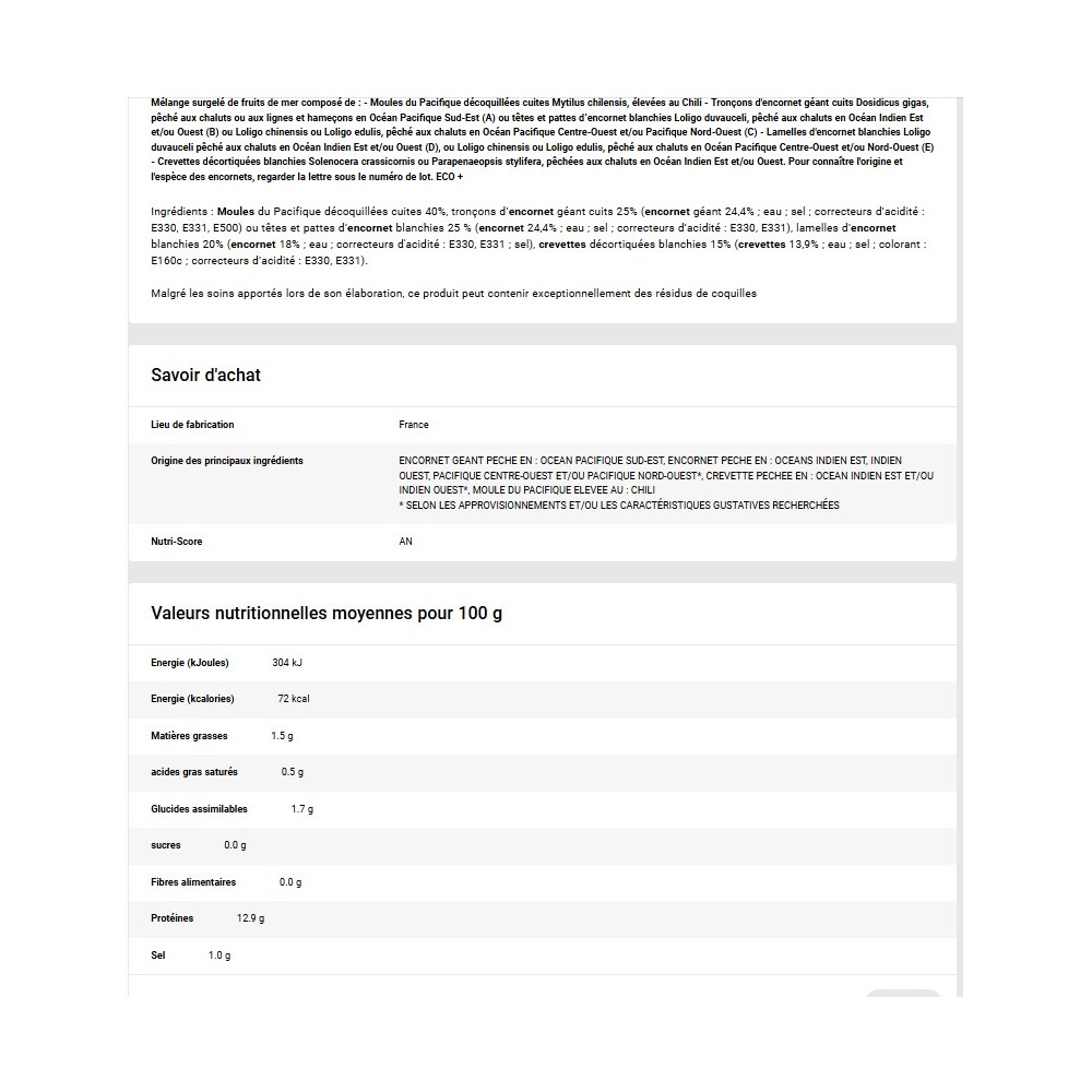 Ingrédients : Moules du Pacifique décoquillées cuites 40%, tronçons d’encornet géant cuits 25% (encornet géant 24,4% ; eau ; sel ; correcteurs d’acidité : E330, E331, E500), lamelles d’encornet blanchies 20% (encornet 18% ; eau ; correcteurs d'acidité : E330, E331 ; sel), crevettes décortiquées blanchies 15% (crevettes 13,9% ; eau ; sel ; colorant : E160c ; correcteurs d’acidité : E330, E331).