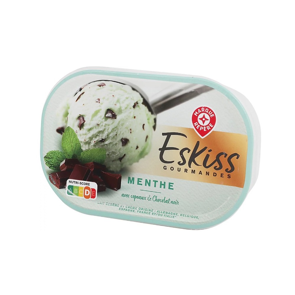 Ingrédients : Eau ; lait écrémé réhydraté ; sirop de glucose ; crème ; sucre ; copeaux de chocolat noir 8 % (pâte de cacao, sucre, beurre de cacao, matière grasse laitière anhydre, émulsifiant : lécithine de soja, arôme naturel de vanille) ; lactose et protéines de lait ; émulsifiant : E471 ; gélifiants : farine de graines de caroube, gomme guar ; arôme naturel de menthe ; colorant : E141.