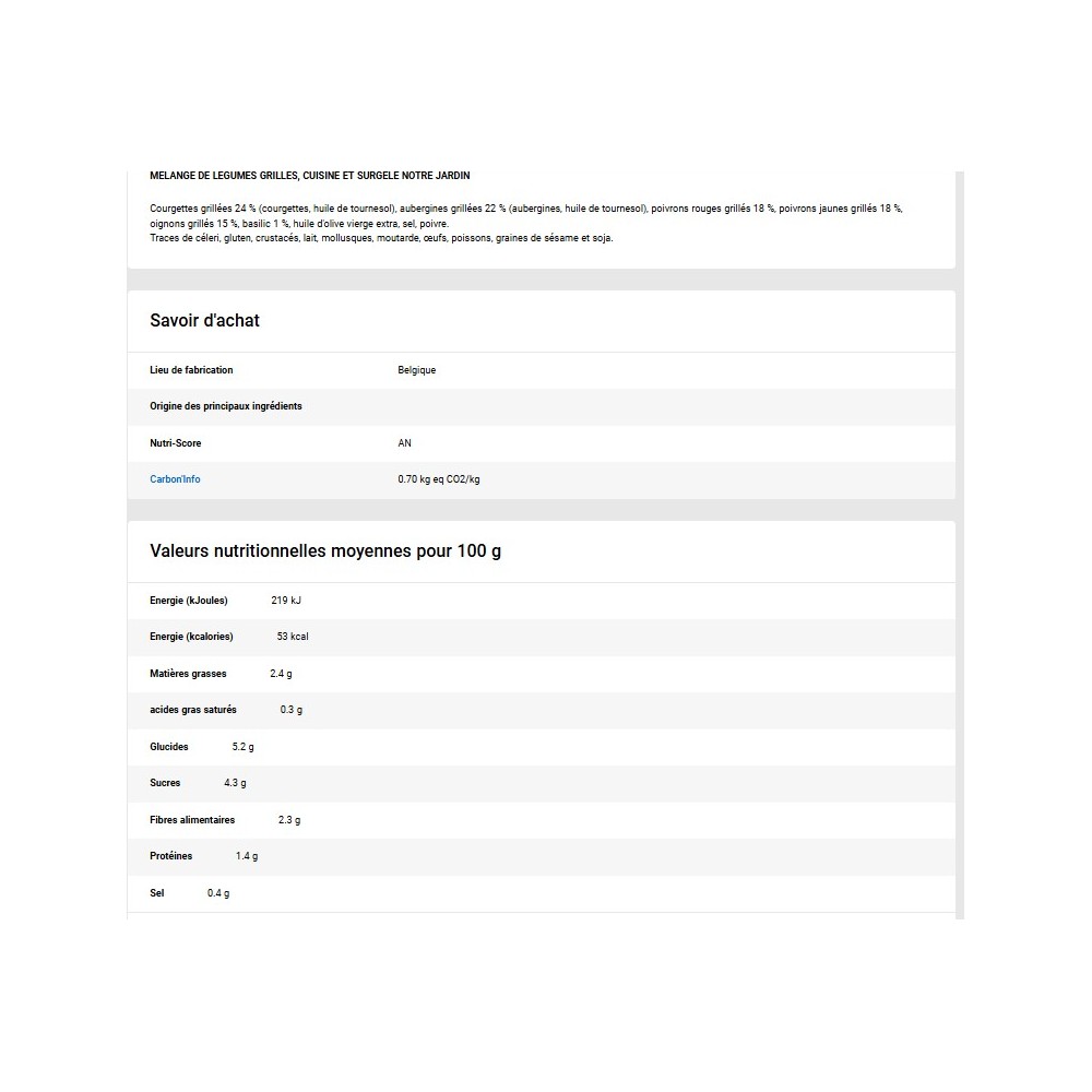 Courgettes grillées 24 % (courgettes, huile de tournesol), aubergines grillées 22 % (aubergines, huile de tournesol), poivrons rouges grillés 18 %, poivrons jaunes grillés 18 %, oignons grillés 15 %, basilic 1 %, huile d'olive vierge extra, sel, poivre.