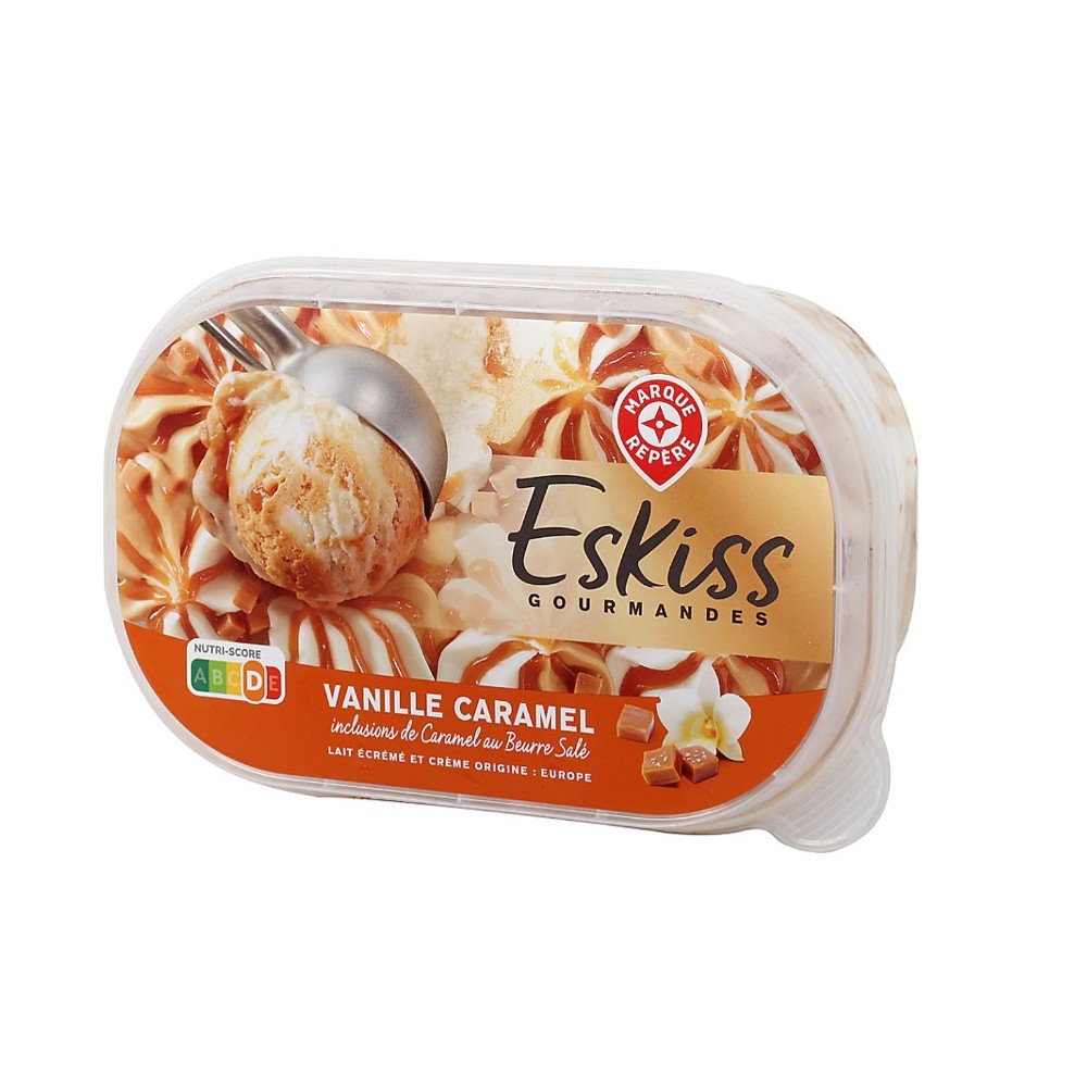 Crème glacée à la vanille, crème glacée caramel au beurre salé aromatisée avec sauce au caramel au beurre salé aromatisée et morceaux de caramel.