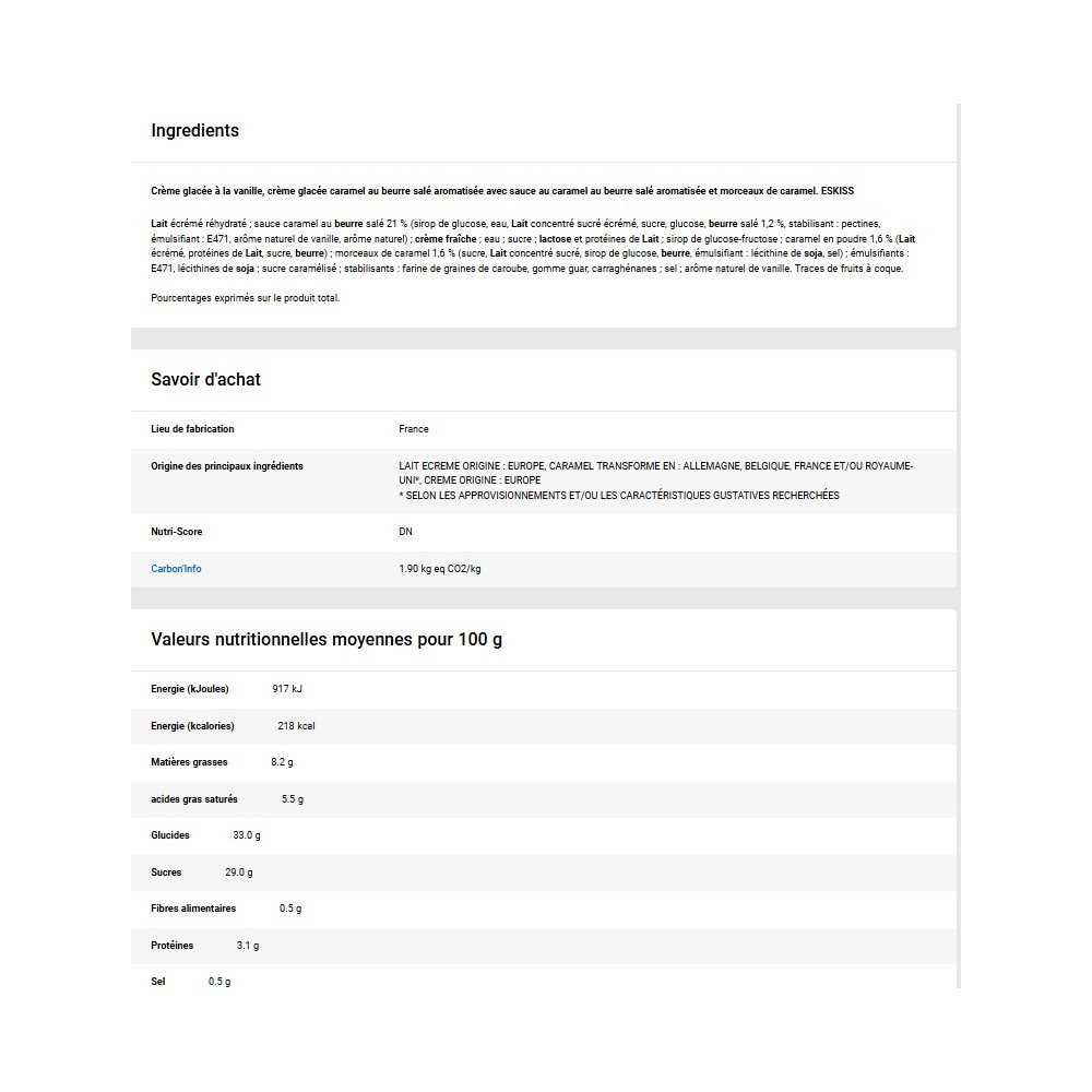 Lait écrémé réhydraté ; sauce caramel au beurre salé 21 % (sirop de glucose, eau, lait concentré sucré écrémé, sucre, glucose, beurre salé 1,2 %, stabilisant : pectines, émulsifiant : E471, arôme naturel de vanille, arôme naturel) ; crème fraîche ; eau ; sucre ; lactose et protéines de lait ; sirop de glucose-fructose ; caramel en poudre 1,6 % (lait écrémé, protéines de lait, sucre, beurre) ; morceaux de caramel 1,6 % (sucre, lait concentré sucré, sirop de glucose, beurre, émulsifiant : lécithine de soja, sel) ; émulsifiants : E471, lécithines de soja ; sucre caramélisé ; stabilisants : farine de graines de caroube, gomme guar, carraghénanes ; sel ; arôme naturel de vanille. Traces de fruits à coque.