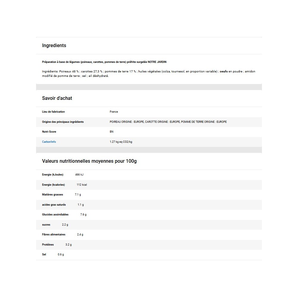 Ingrédients: Poireaux 48 % ; carottes 27,3 % ; pommes de terre 17 % ; huiles végétales (colza, tournesol, en proportion variable) ; oeufs en poudre ; amidon modifié de pomme de terre ; sel ; ail déshydraté.