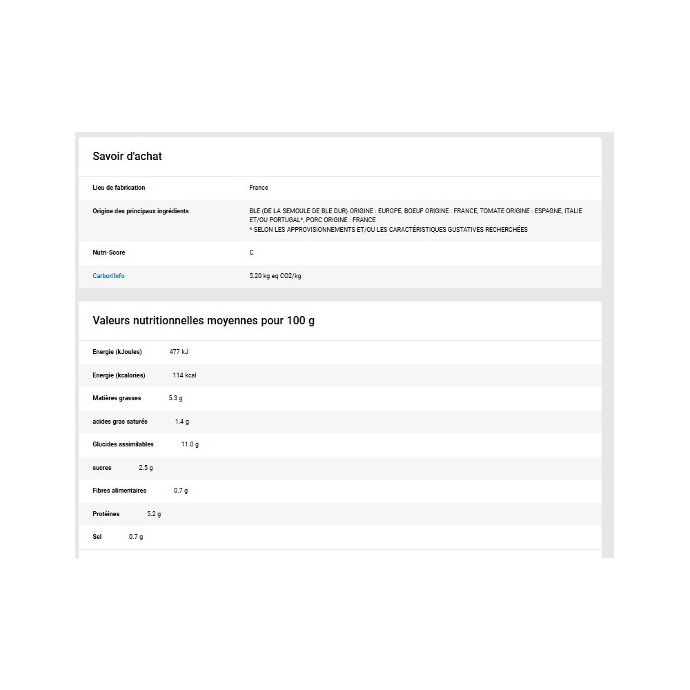 Ingrédients : Eau, semoule de blé dur 16,1 %, pulpe de tomates au jus 8,9 % (tomates, jus de tomate), purée de tomates double concentrée 7,7 %, viande de bœuf 7,4 %, viande de porc 7,4 %, purée de céleri, purée de carotte 2,2 %, emmental râpé 1,9 % (emmental, amidon de pomme de terre), amidon de maïs, poudre de lait entier, farine de blé, contient de l'huile de tournesol et/ou de l'huile de colza, basilic, sel fin, oignon séché, œuf en poudre, beurre, ail, poivre blanc, thym, laurier.