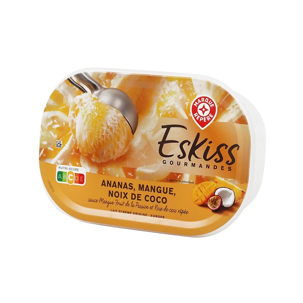 Ingrédients : eau ; sucre ; purée de mangue 10,8 % ; jus d'ananas à base de concentré 10,6 % ; lait écrémé réhydraté ; sirop de glucose ; poudre de lait de noix de coco 2,4 % (lait de noix de coco, maltodextrine, caséinate de sodium (lait)) ; poudre de lactosérum ; noix de coco râpée 1 % ; émulsifiant : E471 ; gélifiants : farine de graines de caroube, gomme guar, pectines, gomme xanthane, gomme Tara ; jus de fruit de la passion concentré 0,4 % ; jus de citron concentré ; arôme naturel d’ananas ; arôme naturel de noix de coco ; protéines de pois hydrolysées ; concentré de carotte ; acidifiant : acide citrique ; concentré de carthame ; arôme naturel de mangue ; colorant : caroténoïdes ; arôme naturel de fruit de la passion.