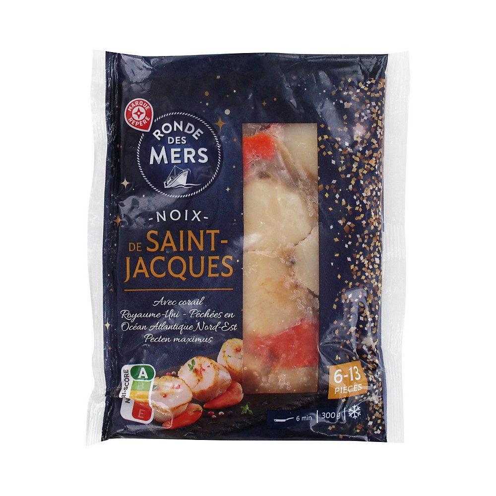 NOIX DE SAINT-JACQUES (PECTEN MAXIMUS) AVEC CORAIL PÊCHÉES À LA DRAGUE EN OCÉAN ATLANTIQUE NORD-EST (MER DU NORD, OUEST ÉCOSSE, MANCHE ORIENTALE ET OCCIDENTALE), SURGELÉES. ORIGINE : ROYAUME-UNI. NOMBRE DE PIÈCES : 6-13.