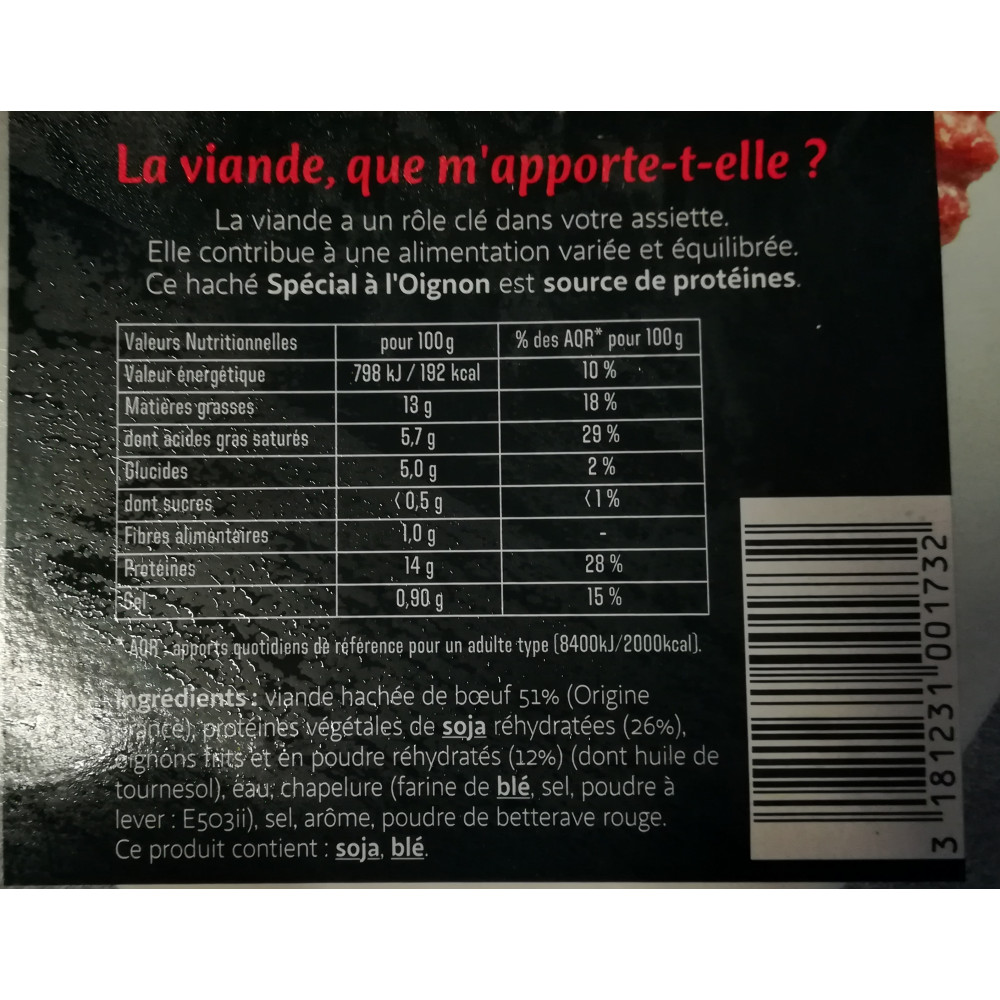 Viande hachée de bœuf (51 %) (origine France), protéines végétales de SOJA réhydratées (26 %), oignons frits et en poudre réhydratés (12 %) (dont huile de tournesol), eau, chapelure (farine de BLE, sel, poudre à lever : E503ii), sel, arôme, poudre de betterave rouge. Ce produit contient : SOJA, BLE.