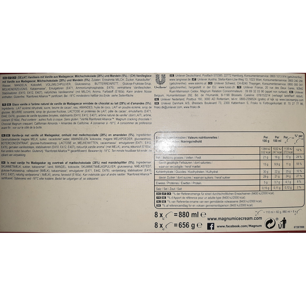 Magnum Amande c'est une onctueuse glace Vanille enrobée d’un épais Chocolat au lait craquant et d’éclats d'Amandes. Parfum historique et emblématique pour Magnum, le bâtonnet gourmand Magnum Amande est un incontournable dans l’univers de la glace depuis plus de 25 ans.