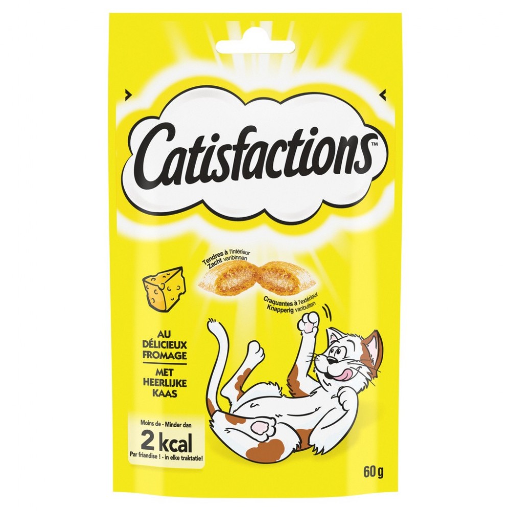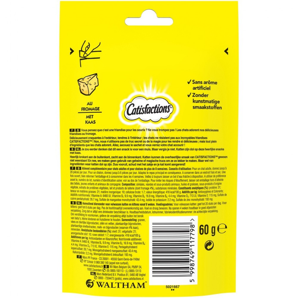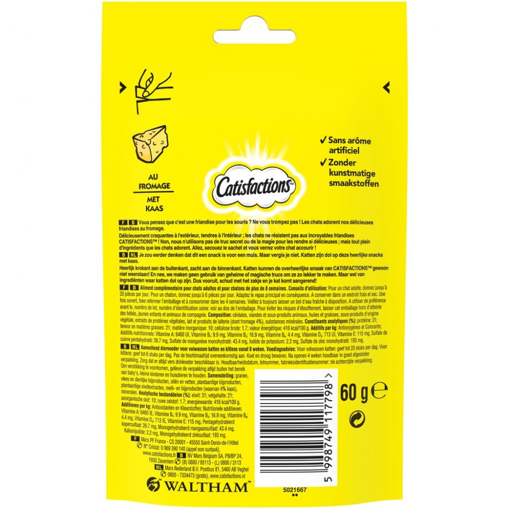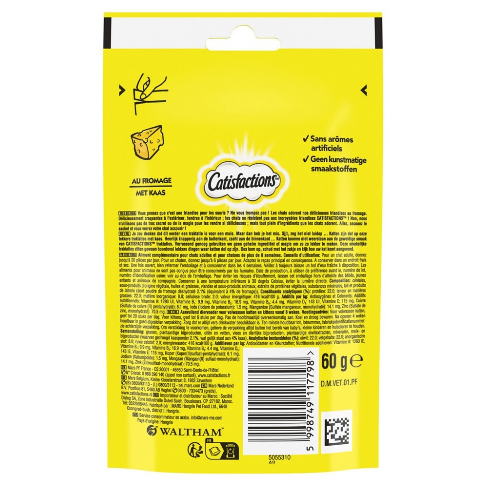 Aliment complémentaire pour chats adultes et chatons de plus de 8 semaines - Au Fromage. Délicieuses friandises Catisfactions ™ craquantes à l'extérieur et tendres à l'intérieur pour lesquelles les chats feraient n'importe quoi ! Non, nous n'utilisons pas de truc secret ou de la magie pour les rendre si délicieuses ; mais tous plein d'ingrédients que les chats adorent. Allez, secouez le sachet et vous verrez votre chat accourir ! Moins de 2 kcal par friandise, ces friandises sont sans arôme artificiel. Friandise pour chat mise au point avec nos nutritionnistes et nos vétérinaires du centre de recherche WALTHAM® - Principale référence mondiale pour la nutrition et le bien-être des animaux de compagnie.