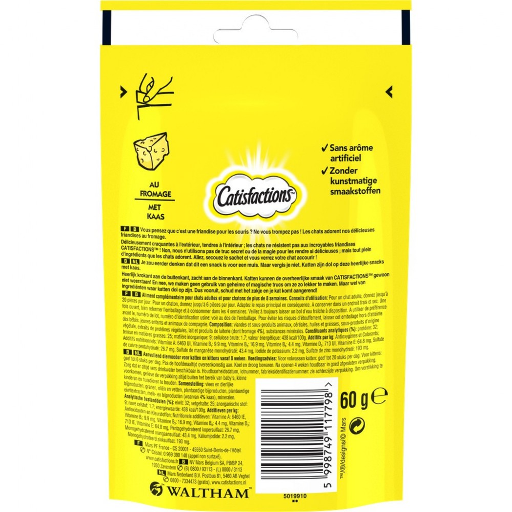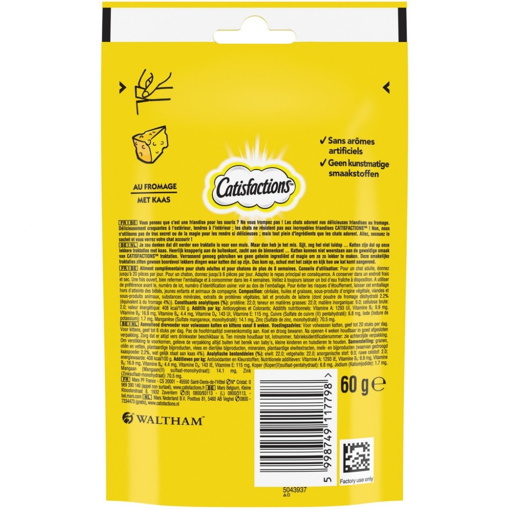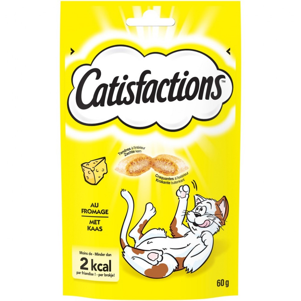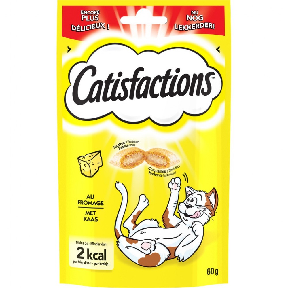 Aliment complémentaire pour chats adultes et chatons de plus de 8 semaines - Au Fromage. Délicieuses friandises Catisfactions ™ craquantes à l'extérieur et tendres à l'intérieur pour lesquelles les chats feraient n'importe quoi ! Non, nous n'utilisons pas de truc secret ou de la magie pour les rendre si délicieuses ; mais tous plein d'ingrédients que les chats adorent. Allez, secouez le sachet et vous verrez votre chat accourir ! Moins de 2 kcal par friandise, ces friandises sont sans arôme artificiel. Friandise pour chat mise au point avec nos nutritionnistes et nos vétérinaires du centre de recherche WALTHAM® - Principale référence mondiale pour la nutrition et le bien-être des animaux de compagnie.