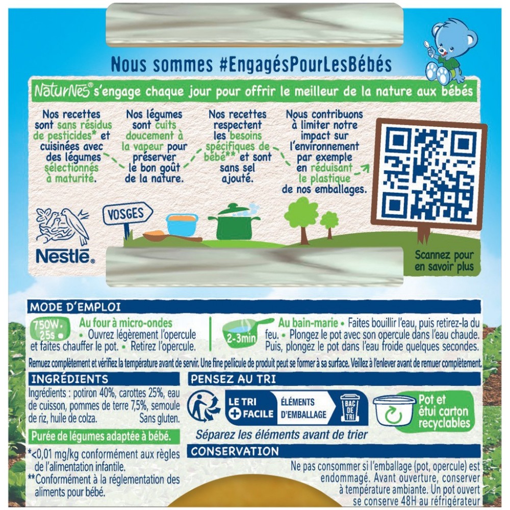 NaturNes® contribue à prendre soin de la nature pour en offir le meilleur à bébé. Nos légumes sont cultivés en plein champs et sélectionnés à maturité dans le respect du rythme de la nature, puis cuits doucement à la vapeur pour préserver au mieux les goûts. Ainsi, pour la diversification alimentaire de bébé, faites lui découvrir nos petits pots pour bébé au potiron élaborés en France dans les Vosges! Entre 4 et 6 mois, demandez conseil à votre médecin pour bien démarrer la diversification.