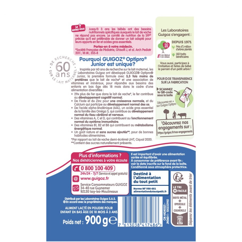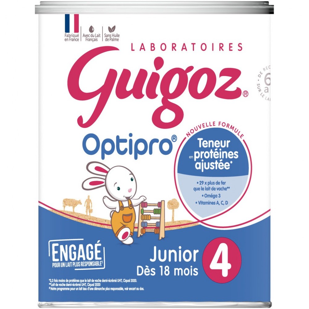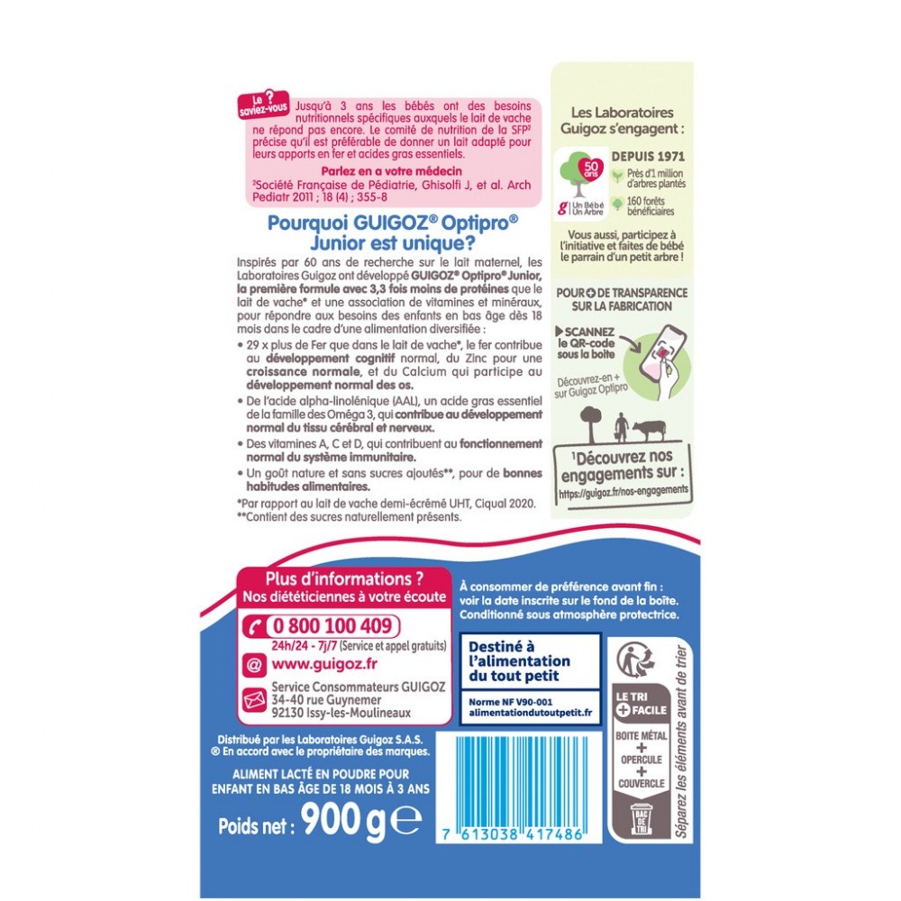 Pourquoi GUIGOZ® Optipro® Junior est unique ? Inspirés par 60 ans de recherche sur le lait maternel, les Laboratoires Guigoz ont développé GUIGOZ® Optipro® Junior, la première formule avec 3,3 fois moins de protéines que le lait de vache* et une association de vitamines et minéraux, pour répondre aux besoins des enfants en bas âge dès 18 mois dans le cadre d'une alimentation diversifiée : - 29x plus de Fer que dans le lait de vache*, le fer contribue au développement cognitif normal, de l'Iode et du Zinc pour une croissance normale, et du Calcium qui participe au développement normal des os. - De l'acide alpha-linolénique (AAL), un acide gras essentiel de la famille des Oméga 3, qui contribue au développement normal du tissu cérébral et nerveux. -Des vitamines A, C et D, qui contribuent au fonctionnement normal du système immunitaire. - Des vitamines B1, B2 et B8 qui contribuent au métabolisme énergétique normal. - Un goût nature et sans sucres ajoutés**, pour de bonnes habitudes alimentaires. *Par rapport au lait de vache demi-écrémé UHT, Ciqual 2020. **Contient des sucres naturellement présents.