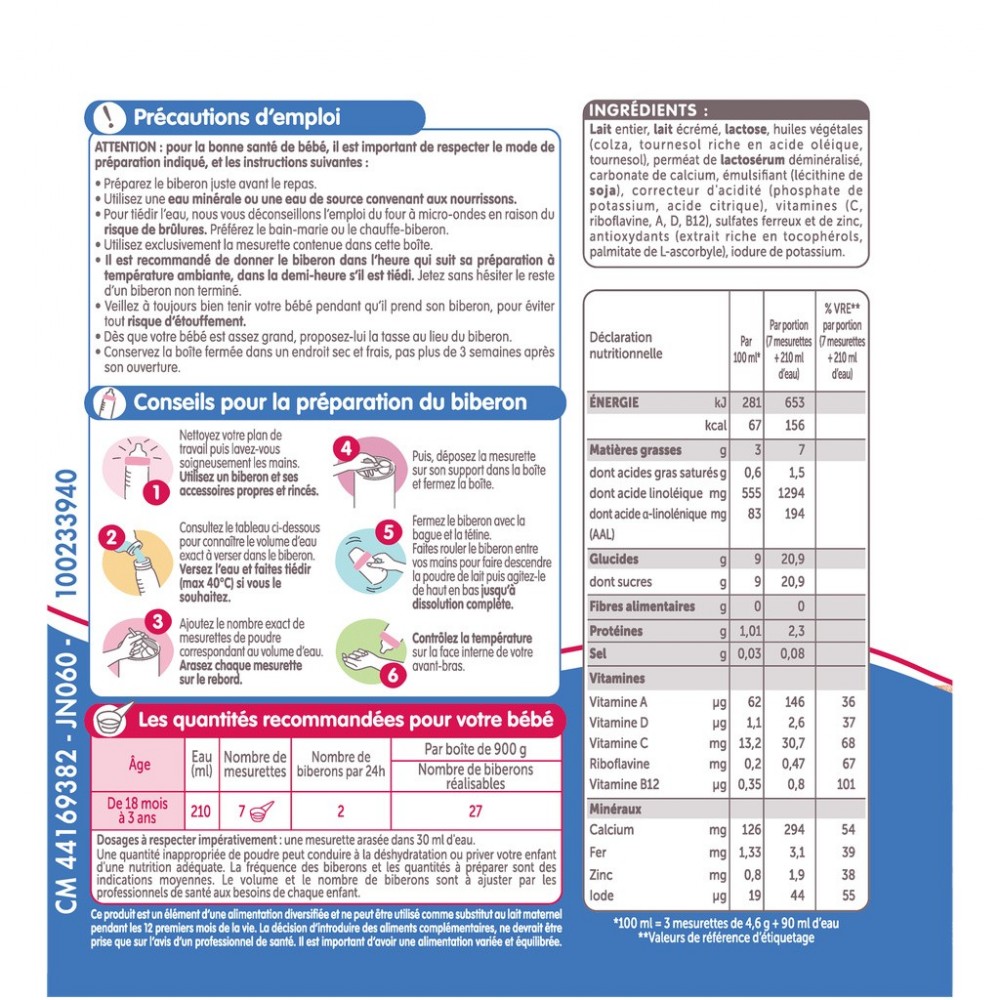 Nettoyez votre plan de travail puis lavez-vous soigneusement les mains. Utilisez un biberon et ses accessoires propres et rincés. Consultez le tableau ci-dessous pour connaître le volume d'eau exact à verser dans le biberon. Versez l'eau et faites tiédir (max 40°C) si vous le souhaitez. Ajoutez le nombre exact de mesurettes de poudre correspondant au volume d'eau. Arasez chaque mesurette sur le rebord. Puis, déposez la mesurette sur son support dans la boîte et fermez la boîte. Fermez le biberon avec la bague et la tétine. Faites rouler le biberon entre vos mains pour faire descendre la poudre de lait puis agitez-le de haut en bas jusqu'à dissolution complète. Contrôlez la température sur la face interne de votre avant-bras. Age : de 1 à 3 ans, Eau(ml) : 210, Nombre de mesurettes : 7, Nombre de biberons par 24h : 2, Nombre de biberons réalisables : 27. Dosages à respecter impérativement : une mesurette arasée (4,6 g) dans 30 ml d'eau. Une quantité inappropriée de poudre peut conduire à la déshydratation ou priver votre enfant d'une nutrition adéquate. La fréquence des biberons et les quantités à préparer sont des indications moyennes. Le volume et le nombre de biberons sont à ajuster par les professionnels de santé aux besoins de chaque enfant. Tout changement de formule peut entrainer, chez certains nourrissons, des modifications transitoires de la fréquence et de la consistance des selles sans qu'il faille s'en inquiéter. En cas de doute, n'hésitez pas à en parler à un professionnel de santé.