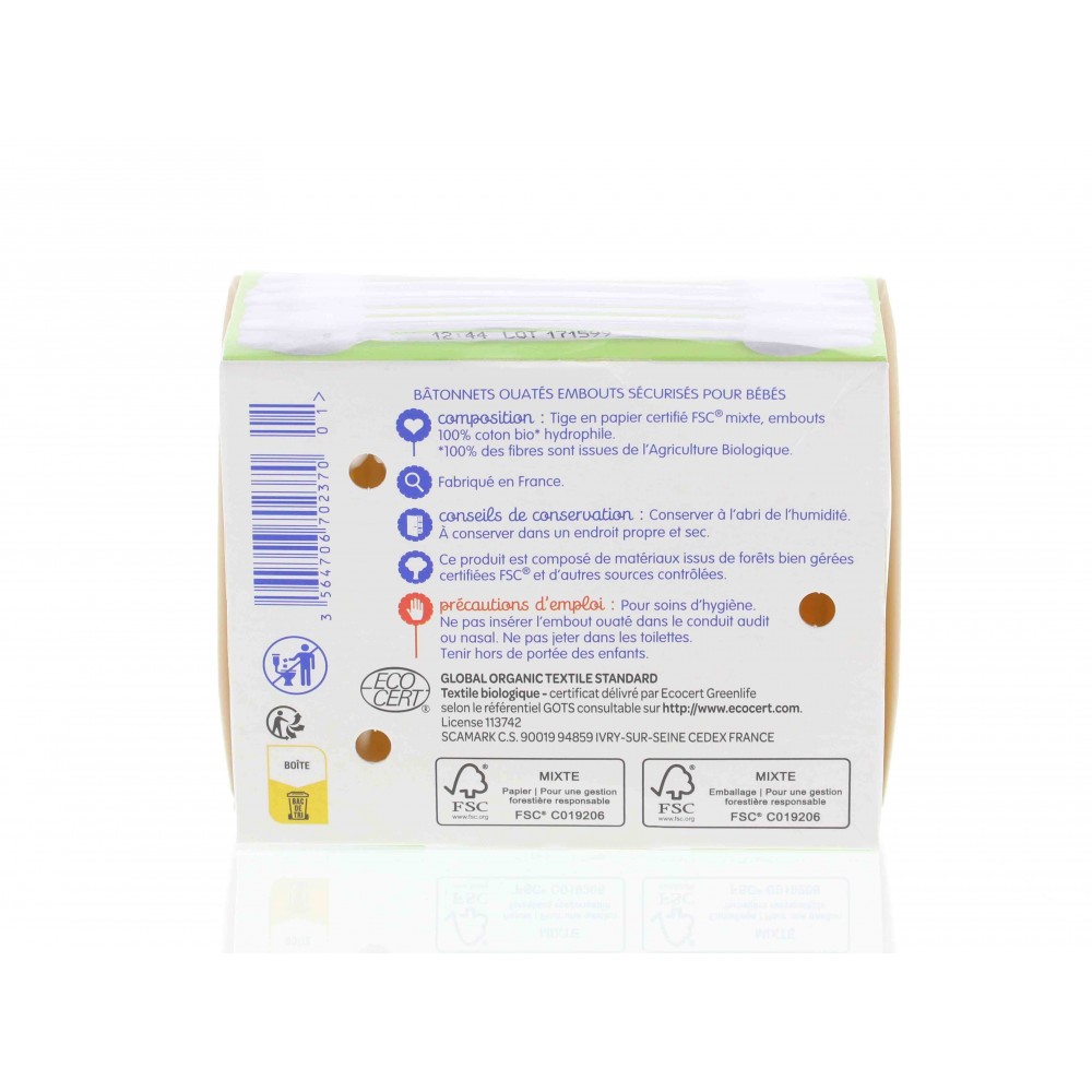 Tige en papier certifié FSC® mixte, coton hydrophile blanchi issu de l'agriculture biologique.
