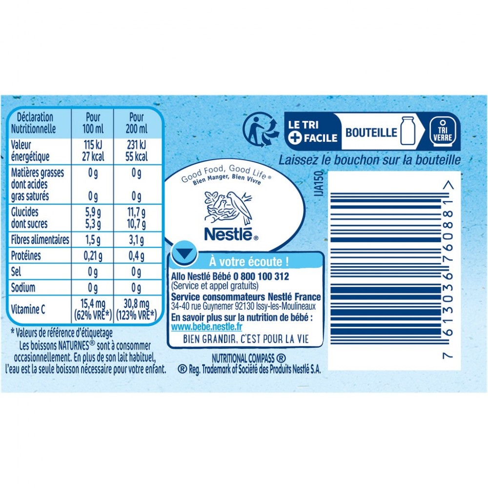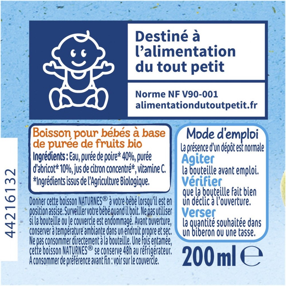 Donner cette boisson Naturnes à votre bébé lorsqu'il est en position assise. Surveiller votre bébé quand il boit. Ne pas utiliser si la bouteille ou le couvercle est endommagé. Ne pas consommer directement à la bouteille. Les boissons Naturnes sont à consommer occasionnellement. En plus de son lait habituel, l'eau est la seule boisson nécessaire pour votre enfant.