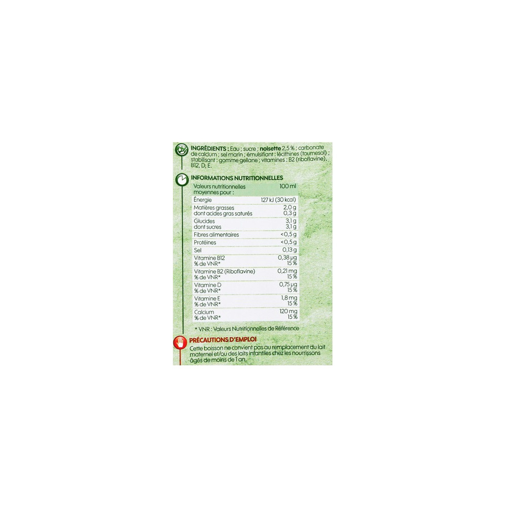 Eau ; sucre ; noisette 2,5 % ; carbonate de calcium ; sel marin ; émulsifiant : lécithines (tournesol); stabilisant : gomme gellane ; vitamines : B2 (riboflavine ), B12, D, E.