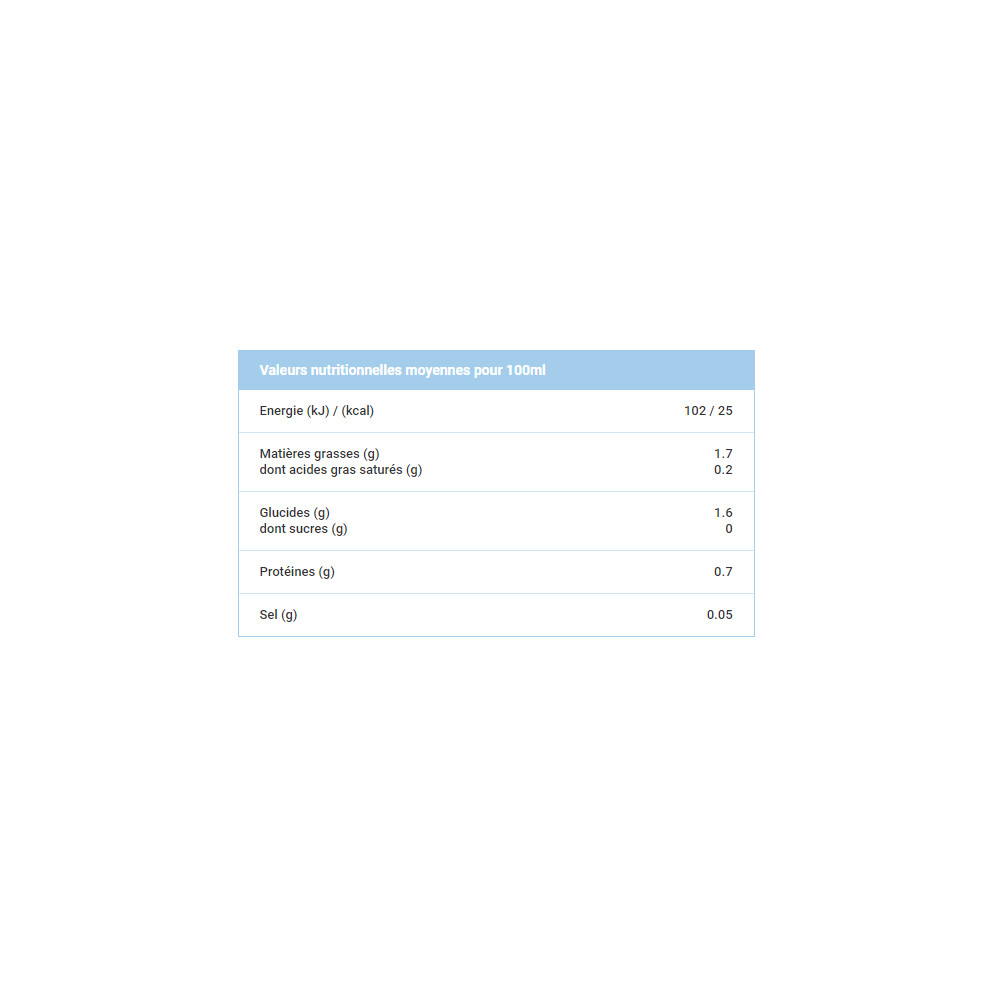 LAIT D'AMANDE* (EAU, AMANDES* 2,8%), amidon de riz*, algue marine Lithothamnium calcareum 0.2%, arôme naturel, épaississant: gomme gellane, sel marin.