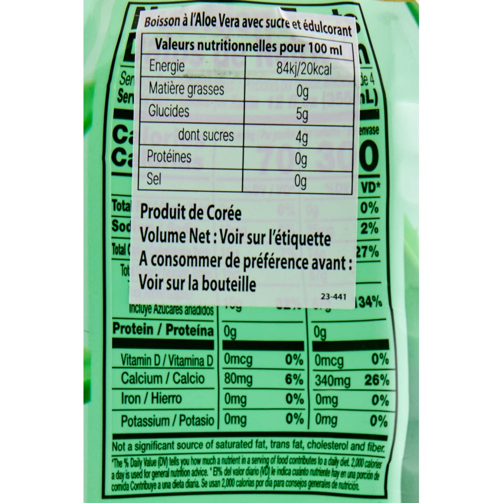 Eau, jus d'aloe vera, gel d'aloe vera, sucre, lactate de calcium, acide c, arôme naturelle et artificielle de raisin, citrate trisodique, gomme gellane, fructose, sucralose