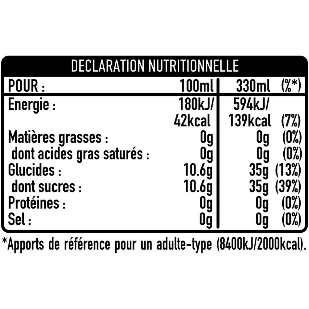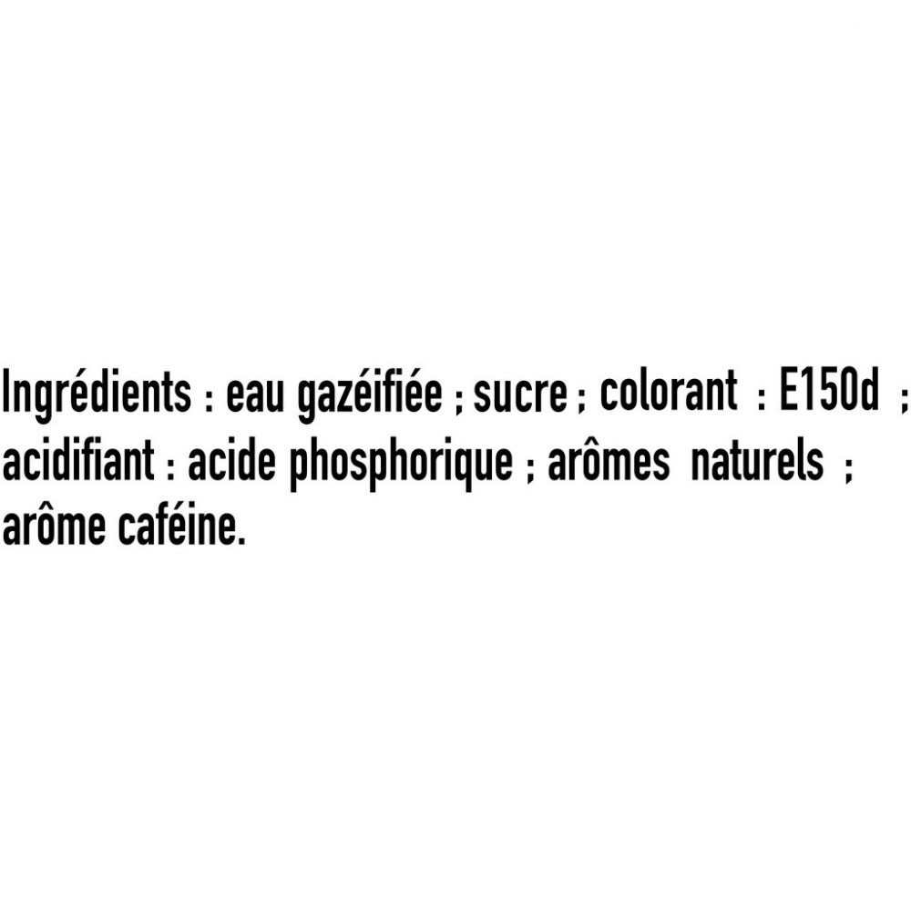 Ingrédients : Ingrédients: eau gazéifiée ; sucre ; colorant : E150d ; acidifiant : acide phosphorique ; arômes naturels ; arôme caféine.