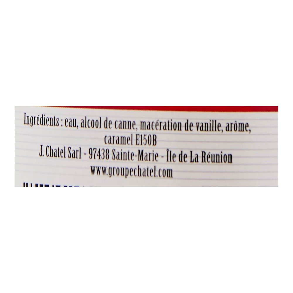 Eau, alcool de canne, macération de vanille, arôme, caramel E150B