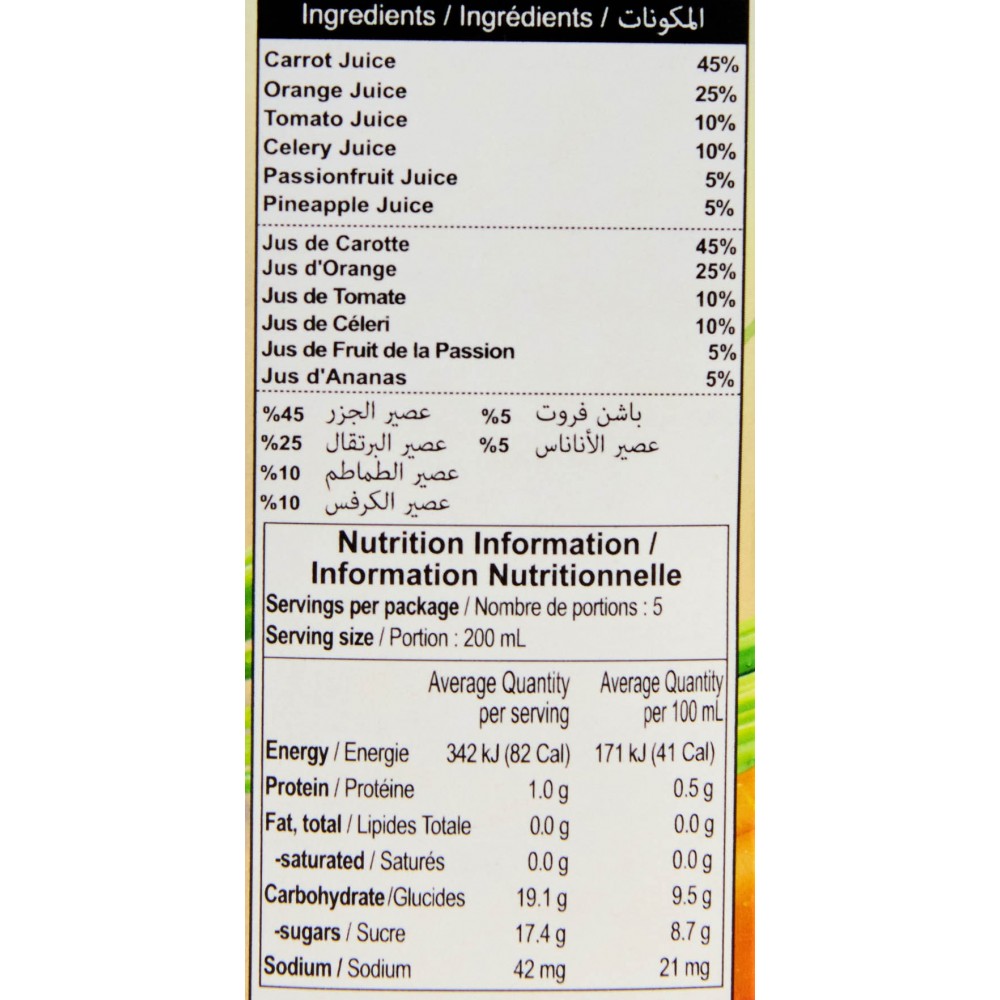 Jus de carotte (45%), jus d'orange (25%), jus de tomate (10%), jus de céleri (10%), jus de fruit de la passion (5%), jus d'ananas (5%)
