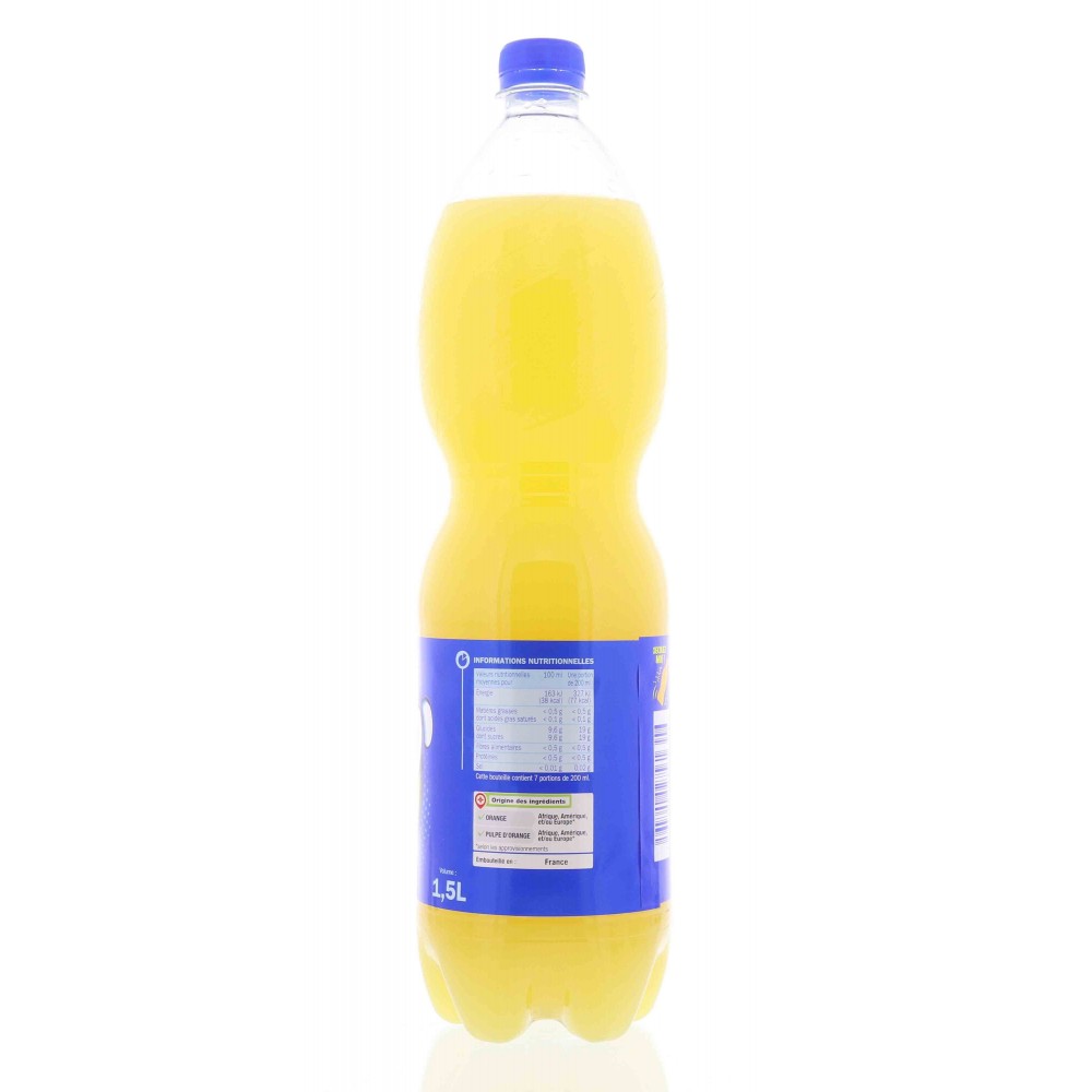 Boisson gazéifiée au jus d'orange à base de concentré et à la pulpe d'orange, aromatisée.