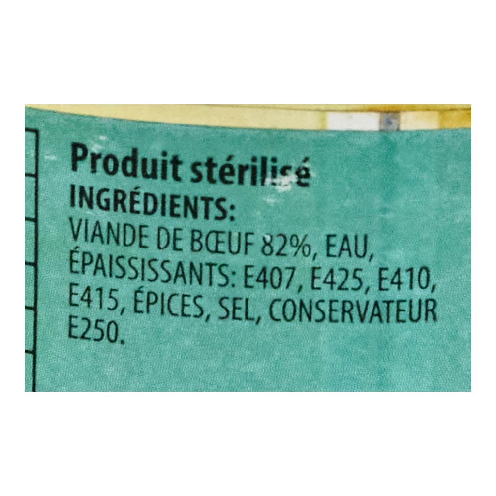 viande de boeuf(82%),eau,épaississant:E407,E425,E410,E415,épices,sel,conservateur:E250