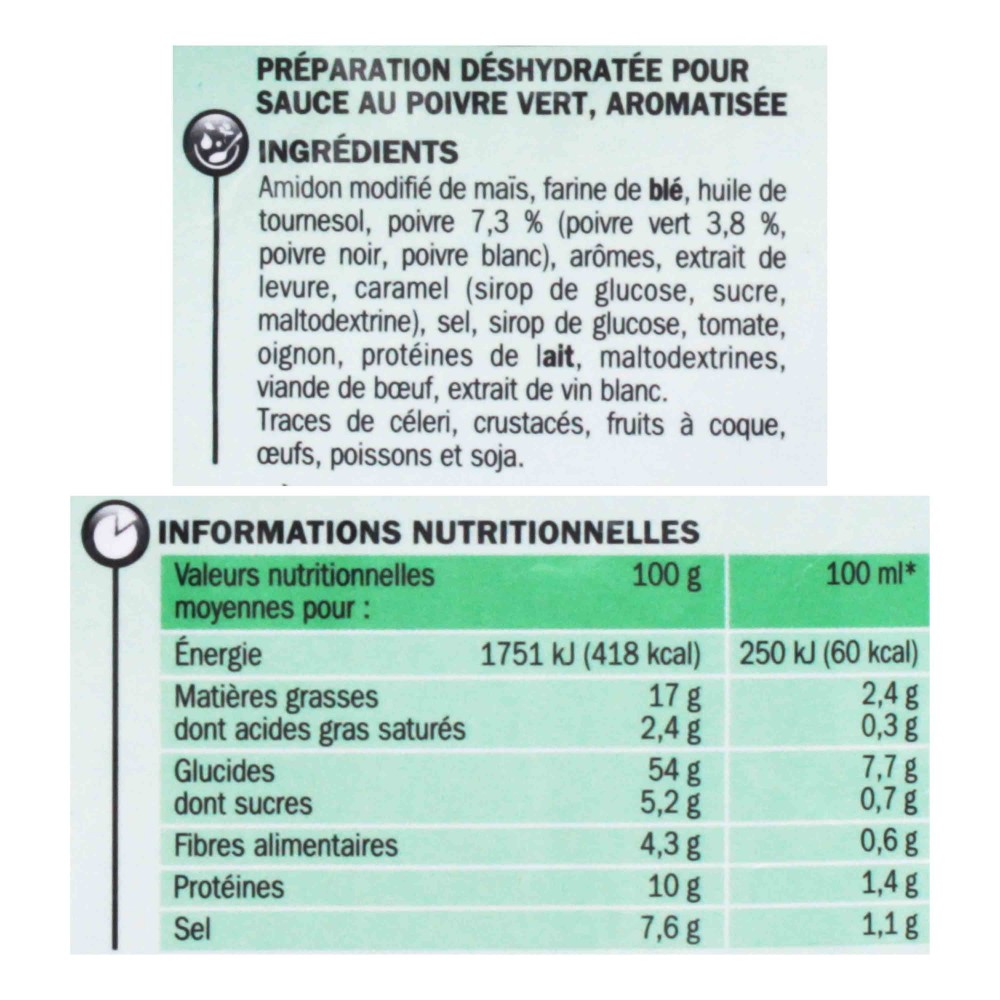 Ingrédients: Amidon modifié de maïs, farine de blé, huile de tournesol, poivre 7,3 % (poivre vert 3,8 %, poivre noir, poivre blanc), arômes (dont orge), extrait de levure, colorant : caramel ordinaire, sel, sirop de glucose, tomate, extrait de vin blanc, oignon, protéines de lait, viande de bœuf cuite.