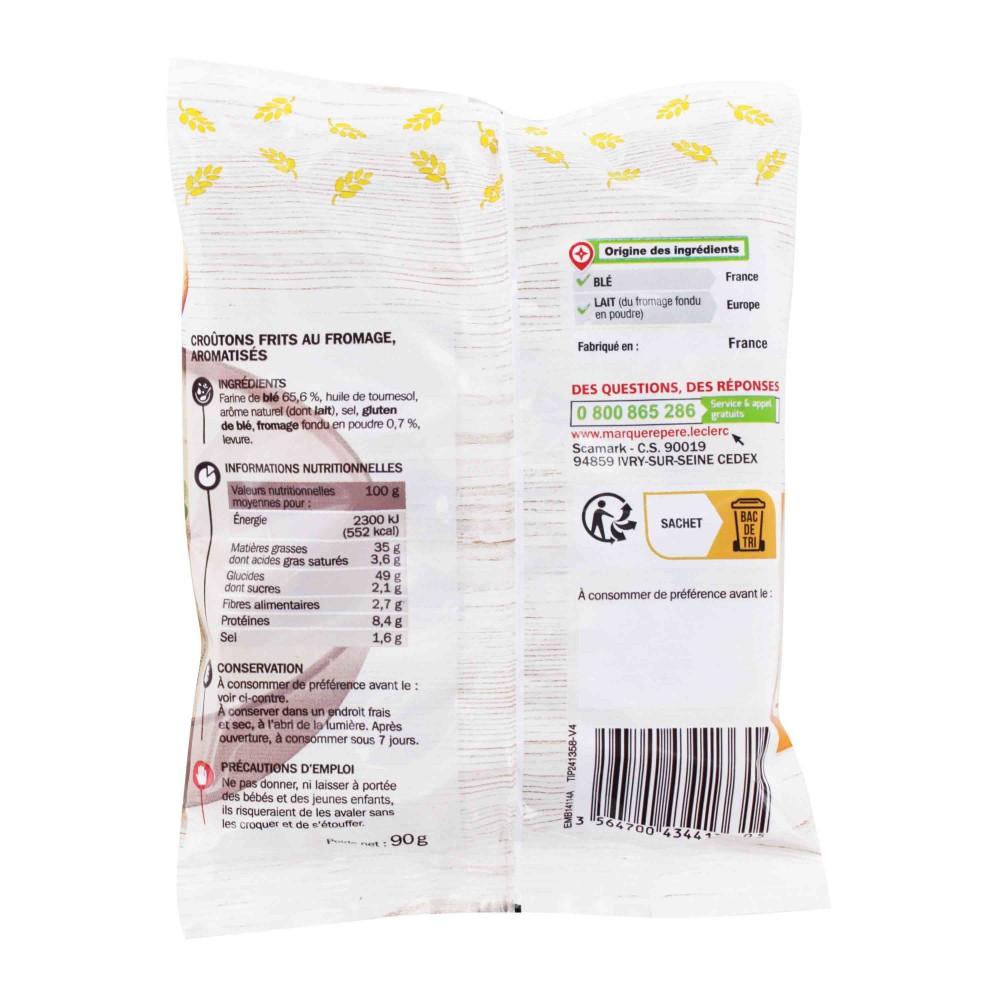 Ingrédients : Farine de blé 65,6 %, huile de tournesol, arôme naturel (dont lait), sel, gluten de blé, fromage fondu en poudre 0,7 %, levure.