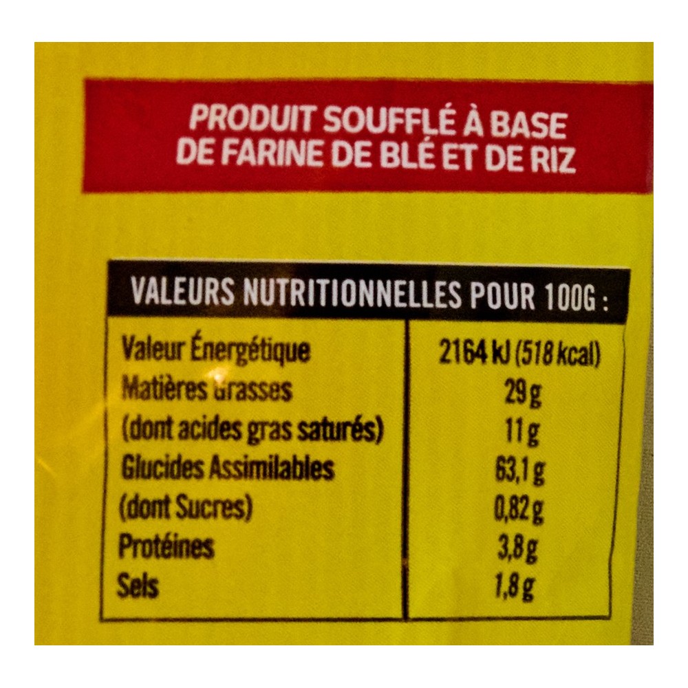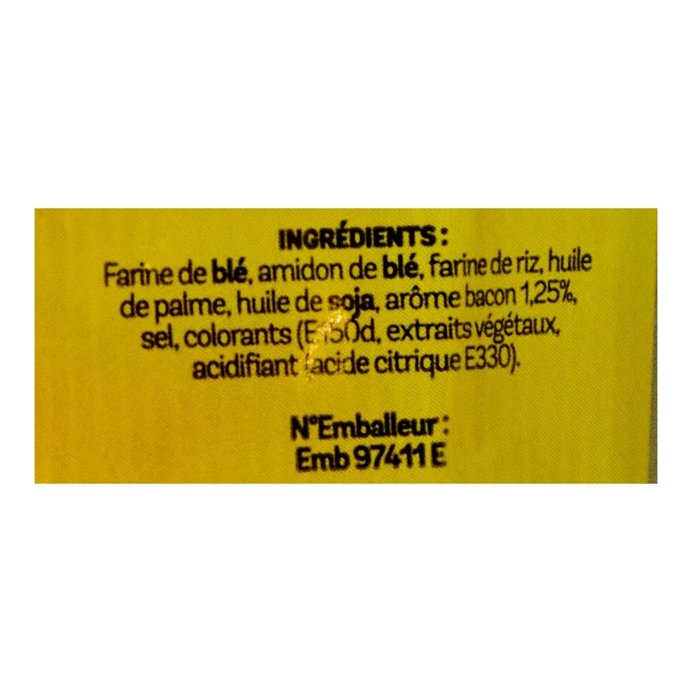 farine de blé,amidon de blé,farine de riz,huile de palme,huile de soja,arome bacon 1,25%,sel,colorant(E150d,extraits végétaux,acidifiant(acide citriqueE330))