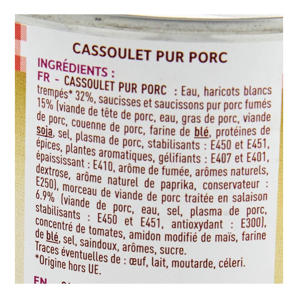 Eau, haricots blancs trempés 32%, saucisses et saucissons pur porc fumés 15% (Viande de tête de porc, eau, gras de porc, viande de porc, couenne de porc, farine de blé, protéines de soja, sel, plasma de porc, stabilisants : E450 et E451, épices, plantes aromatiques, gélifiants : E407 et E401, épaississant : E410, arôme de fumée, arômes naturels, dextrose, arôme naturel de paprika, conservateur E 250), morceau de viande de porc traitée en salaison 6,9% (viande de porc, eau, sel, plasma de porc, stabilisants : E450 et E451, antioxydant : E300), concentré de tomates, amidon modifié de maïs, farine de blé, sel, saindoux, arômes, sucre.