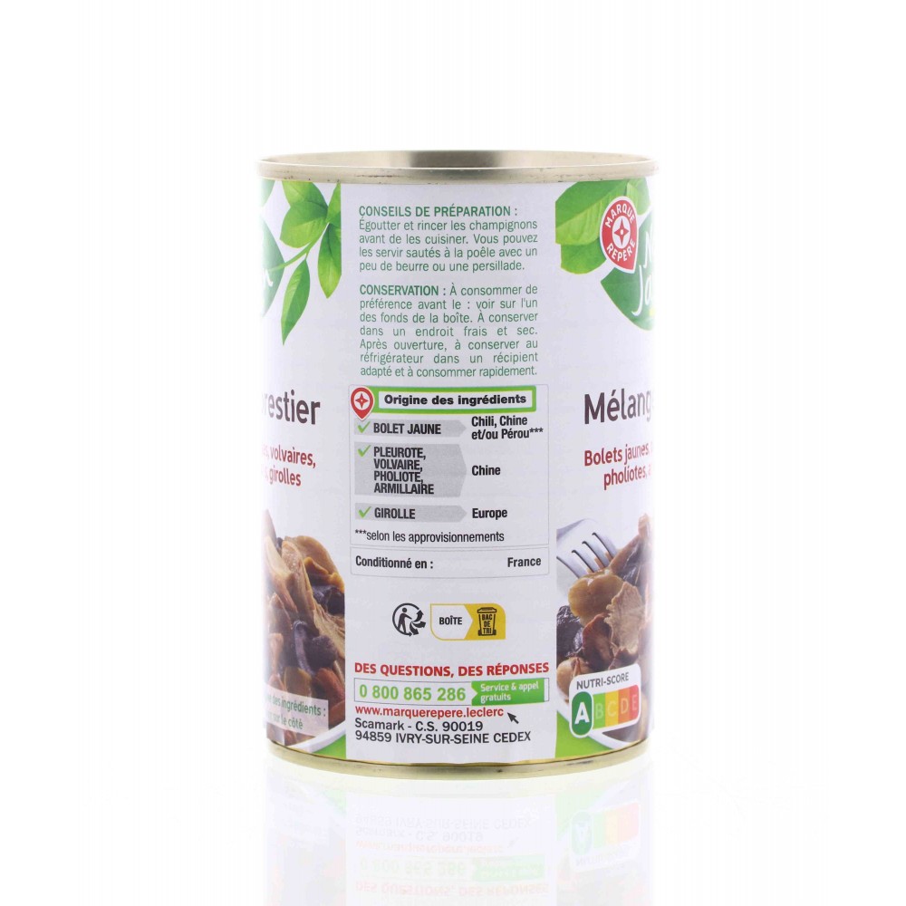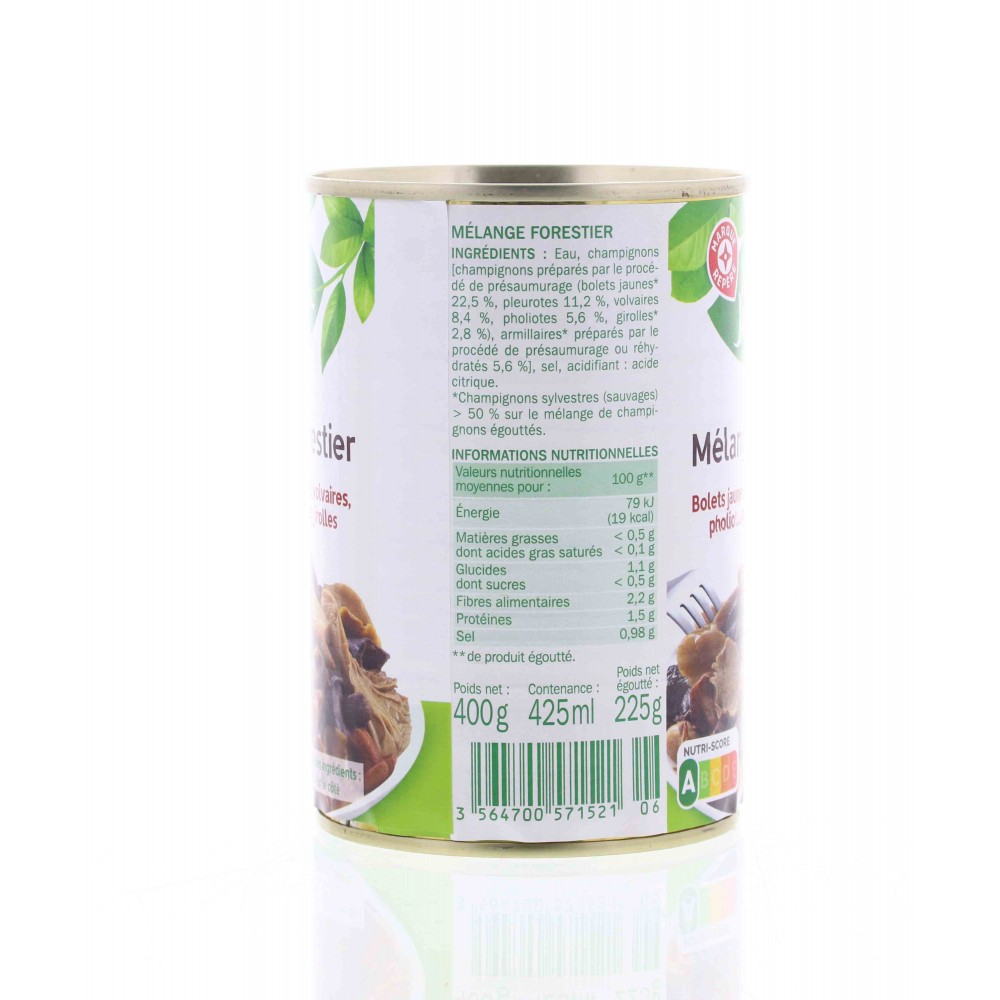 Ingrédients : Eau, champignons [champignons préparés par le procédé de présaumurage ou réhydratés (bolets jaunes* 22,5 %, armillaires* 5,6 %), champignons préparés par le procédé de présaumurage (pleurotes 11,2 %, volvaires 8,4 %, pholiotes 5,6 %, girolles* 2,8 %)], sel, acidifiant : acide citrique.