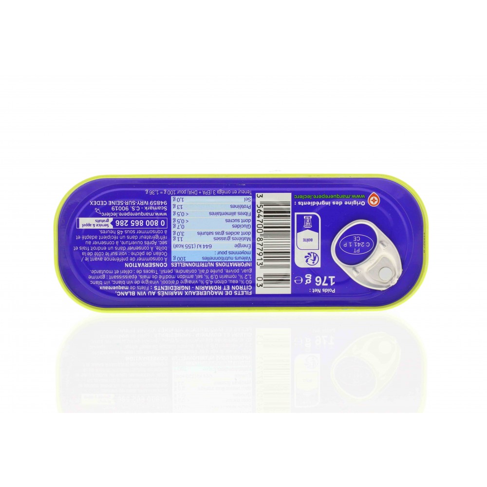 Ingrédients: Filets de maquereaux 60 %, eau, citron 4,5 %, vinaigre d'alcool, vinaigre de vin blanc, vin blanc 1,2 %, romarin 0,9 %, sel, amidon modifié de maïs, épaississant : gomme guar, poivre, purée d'ail, coriandre, persil.