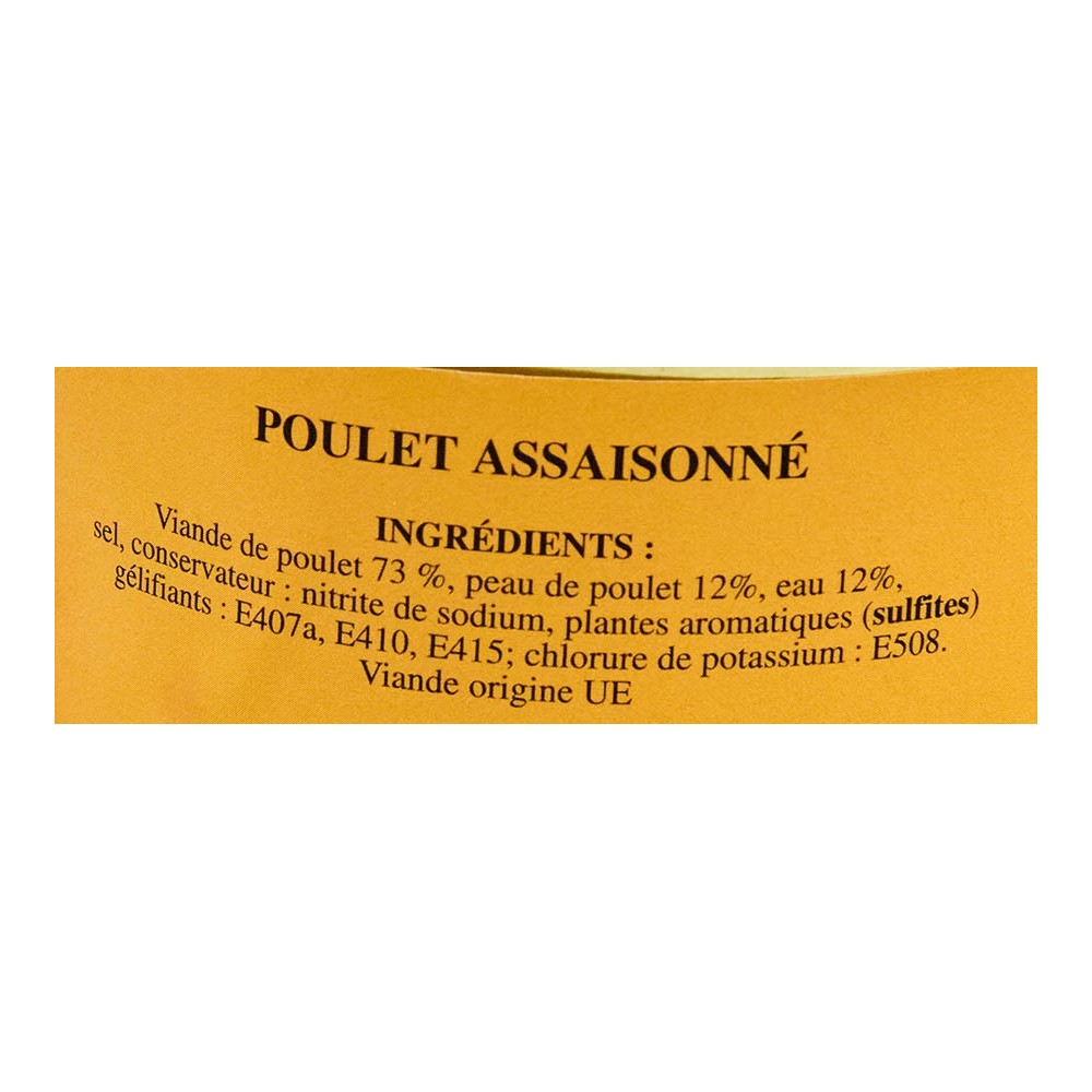 Viande de poulet(73%),peau de poulet(12%),eau(12%),sel,conservateur:nitrite de sodium,plantes aromatiques(sulfites)gélifiants:E407a,E415,chlorure de potassium:E508