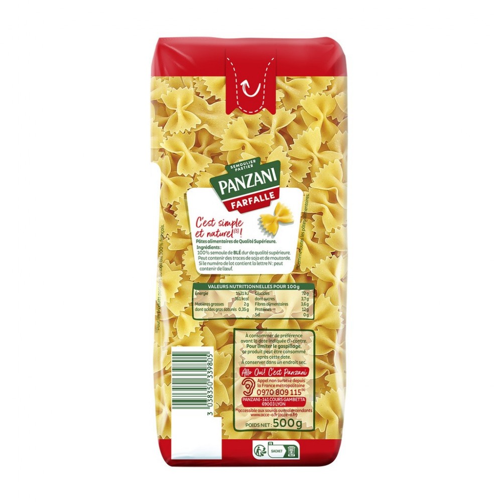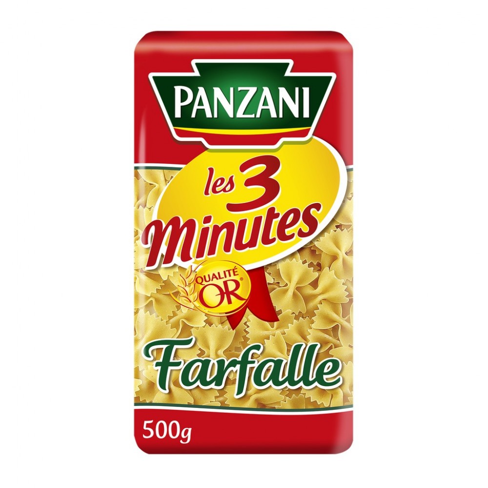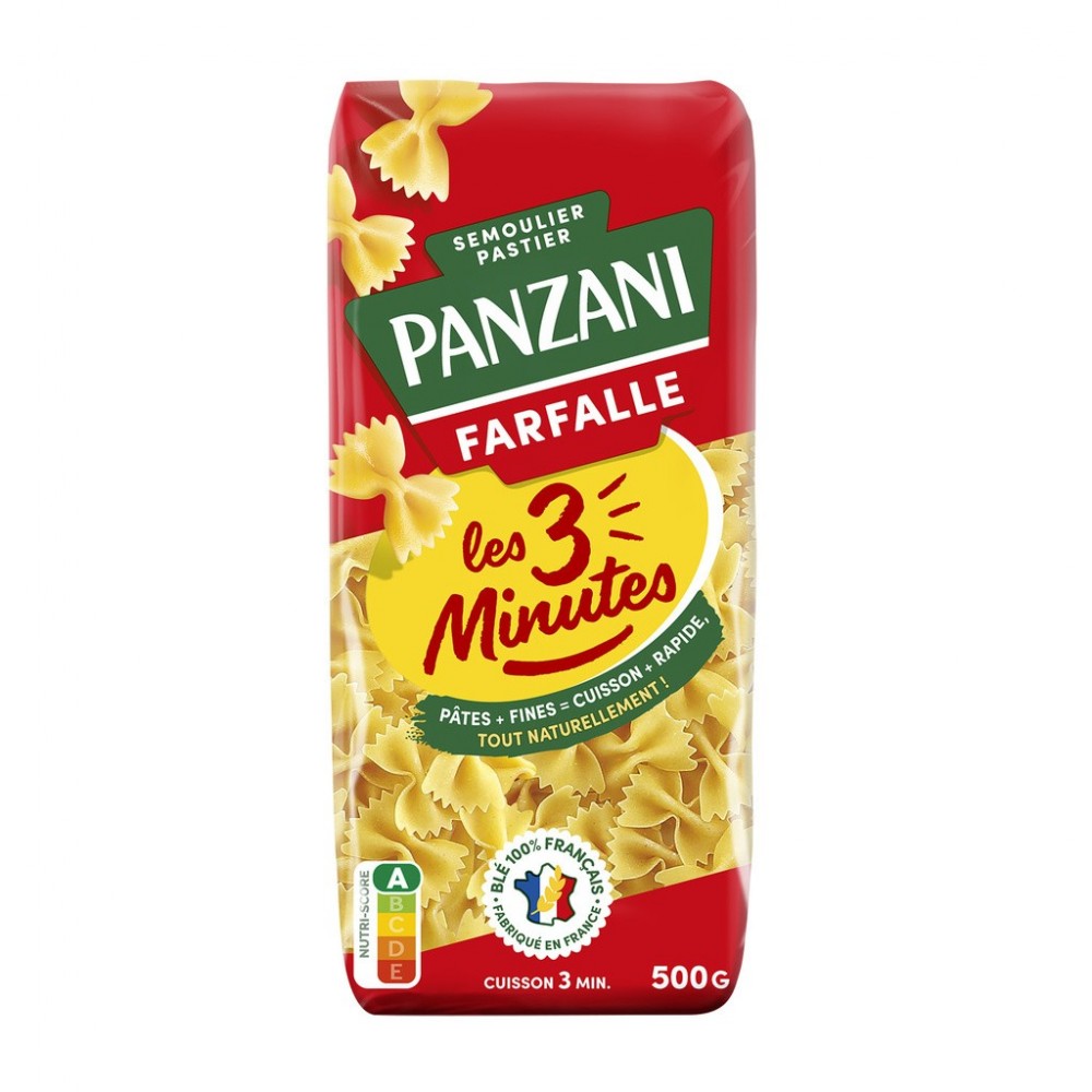 Nos farfalle 3 minutes Panzani c'est tout le plaisir et la qualité des pâtes Panzani au blé 100% français, prêtes en seulement 3 minutes grâce à une pâte plus fine qui permet une cuisson plus rapide, tout naturellement. Elles sont fabriquées avec amour dans nos usines de pâtes de Marseille et Nanterre.