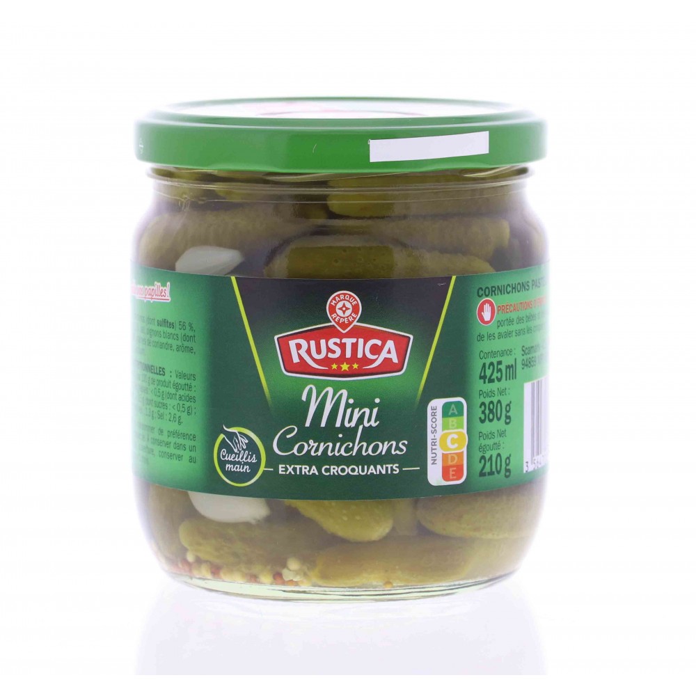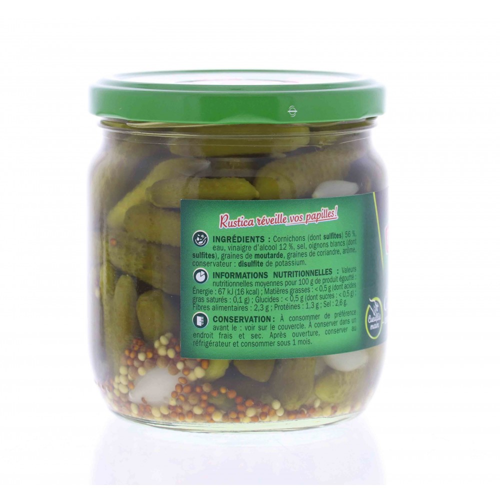 Ingrédients: Cornichons (dont sulfites) 56 %, eau, vinaigre d'alcool, sel, oignons blancs (dont sulfites), graines de moutarde, graines de coriandre, arôme, conservateur : disulfite de potassium.