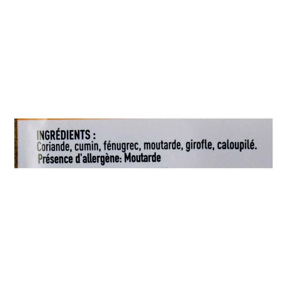 Coriande, cumin,fénugrec , moutarde, girofle, caloupilé