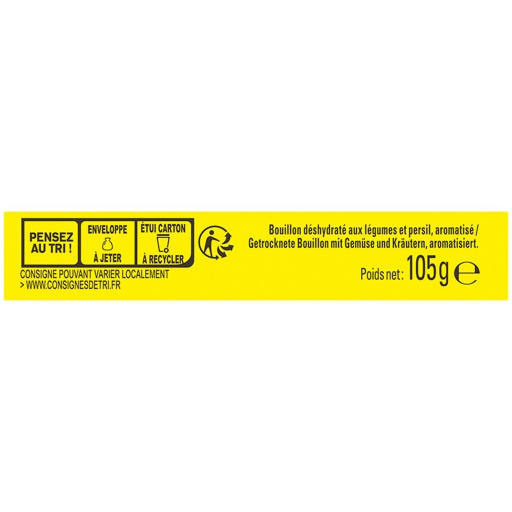 Ingrédients : sel iodé, sucre, légumes 12,1% : carotte 6,8%, oignon 5%, tomate; fécule, huile de palme*, sel minéral (chlorure de potassium), arômes, sel, persil 1,5%, extrait de levure, huile de tournesol, extraits de poireau et de CÉLERI, curcuma. Peut contenir : ŒUFS, LAIT, GLUTEN.