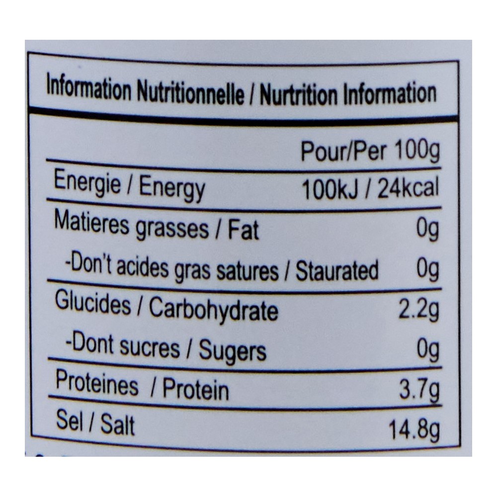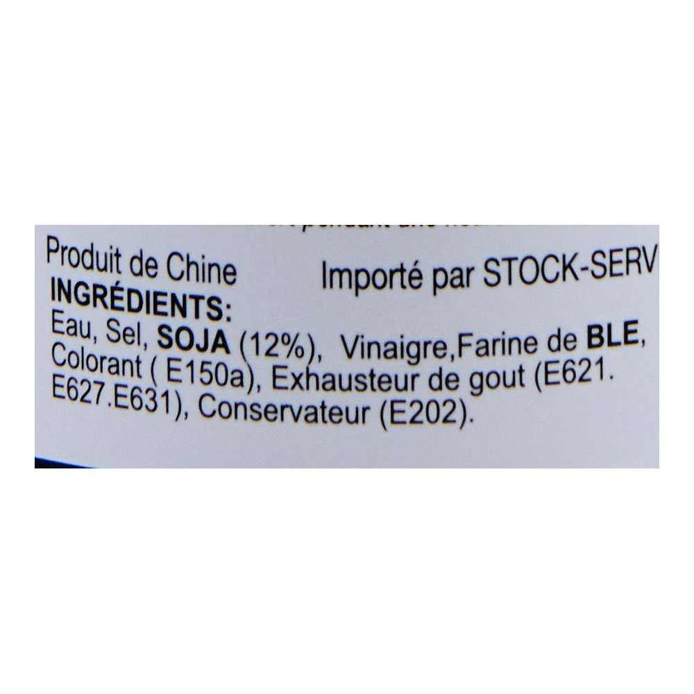 Eau, sel, soja (12%), vinaigre, farine de blé, Colorant (E150a), Exhausteur de gout (E621, E627, E631), conservateur (E202).