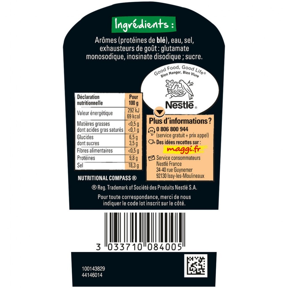 Ingrédients: Arômes (protéines de BLE), eau, sel, exhausteurs de goût : glutamate monosodique, inosinate disodique ; sucre.