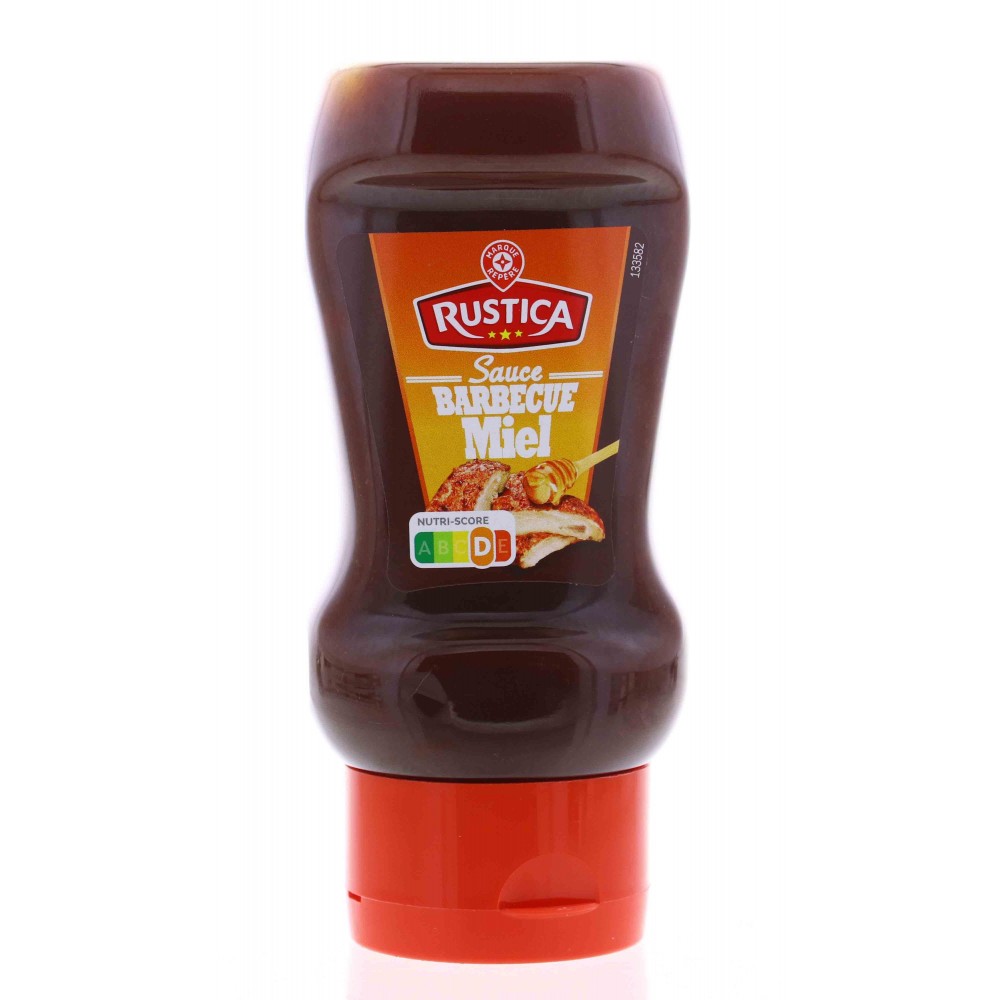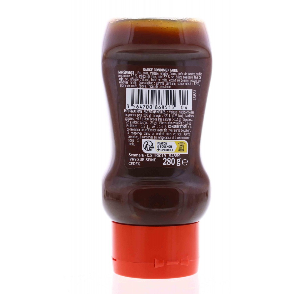 Ingrédients : Eau, sucre, mélasse, vinaigre d'alcool, purée de tomates double concentrée 6,9 %, amidon de maïs, miel 2,3 %, sel, sauce soja (eau, fève de soja, sel, vinaigre d'alcool), huile de colza, extrait de pomme, poudre de dextrose fumée, épaississant : gomme xanthane, conservateur : E200, arôme de fumée, épices.