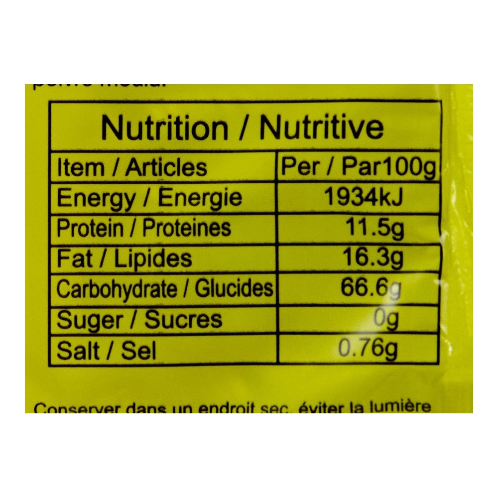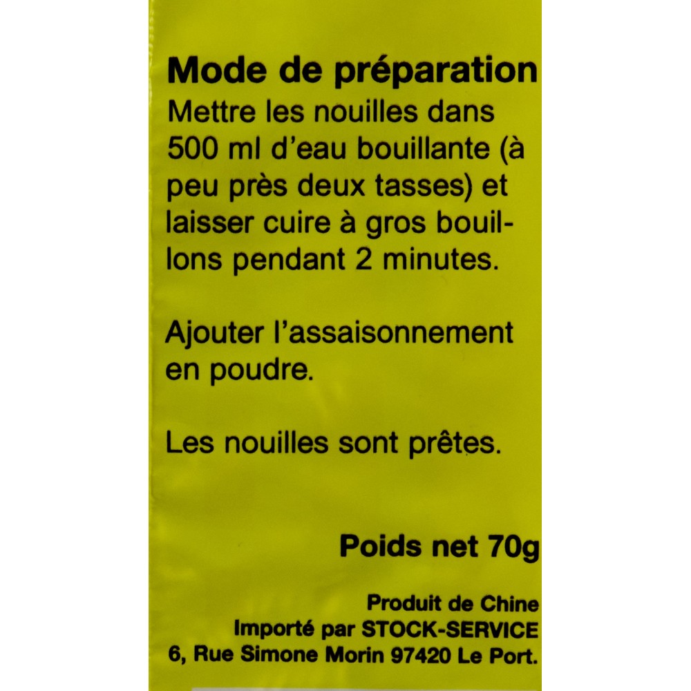 farine de ble, huilde de palme, anti-agglomerant: carbonate de sodium, stabilisant: carbonate de potassium, anti-oxydant: vitamine ETBHQ, colorant: gardenia jeune Assaisonnements: sel, sucre, gutamate monosodique, poudre de sauce soja, arome de poulet , poudre de piment.