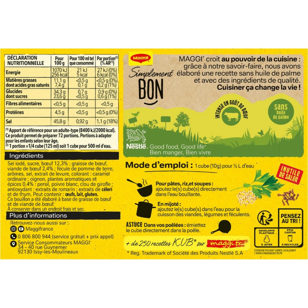 Retrouvez tout le bon goût du bœuf dans un petit cube ! Recette intense en goût de boeuf relevé aux herbes et épices, sans huile de palme et avec des ingrédients de qualité. Pour vos viandes rouges et vos recettes de légumes, utilisez le Bouillon KUB Bœuf pour rehausser le goût de vos plats. Existe aussi en format 8 cubes. Astuce : pour apporter une délicieuse note cuisinée à votre sauce bolognaise, émiettez un bouillon directement dans votre préparation à la tomate !