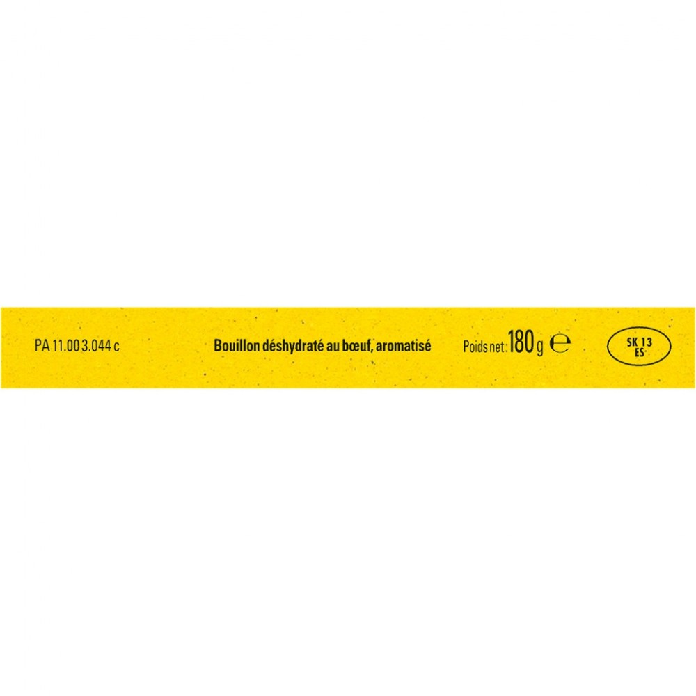 Ingrédients: Sel iodé, sucre, bœuf 12,3% : graisse de bœuf, viande de bœuf 2,4% ; fécule de pomme de terre, arômes, sel, extrait de levure, colorant : caramel ordinaire ; oignon, plantes aromatiques et épices 0,4% : persil, poivre blanc, clou de girofle ; antioxydant : extraits de romarin ; extraits de CELERI et de thym. Peut contenir : œufs, lait, gluten.