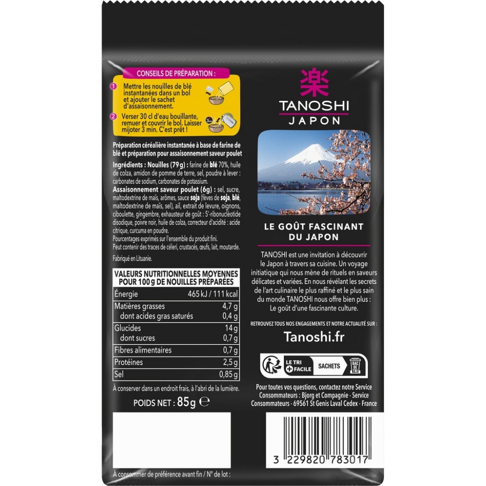 Nouilles (79g): farine de blé 70%, huile de tournesol, amidon de pomme de terre, sel, poudre à lever: carbonates de sodium, carbonates de potassium.
