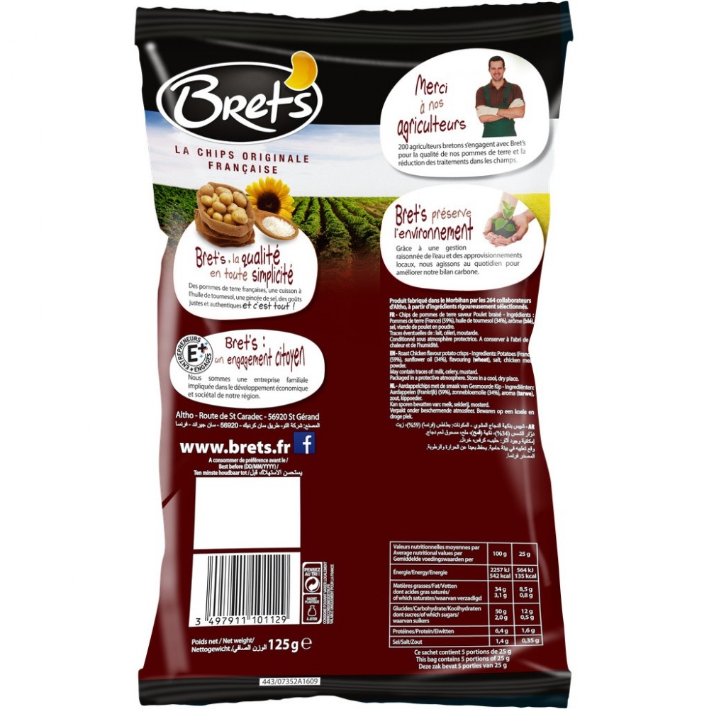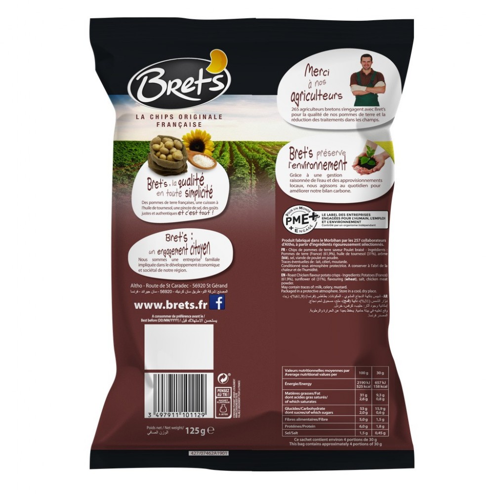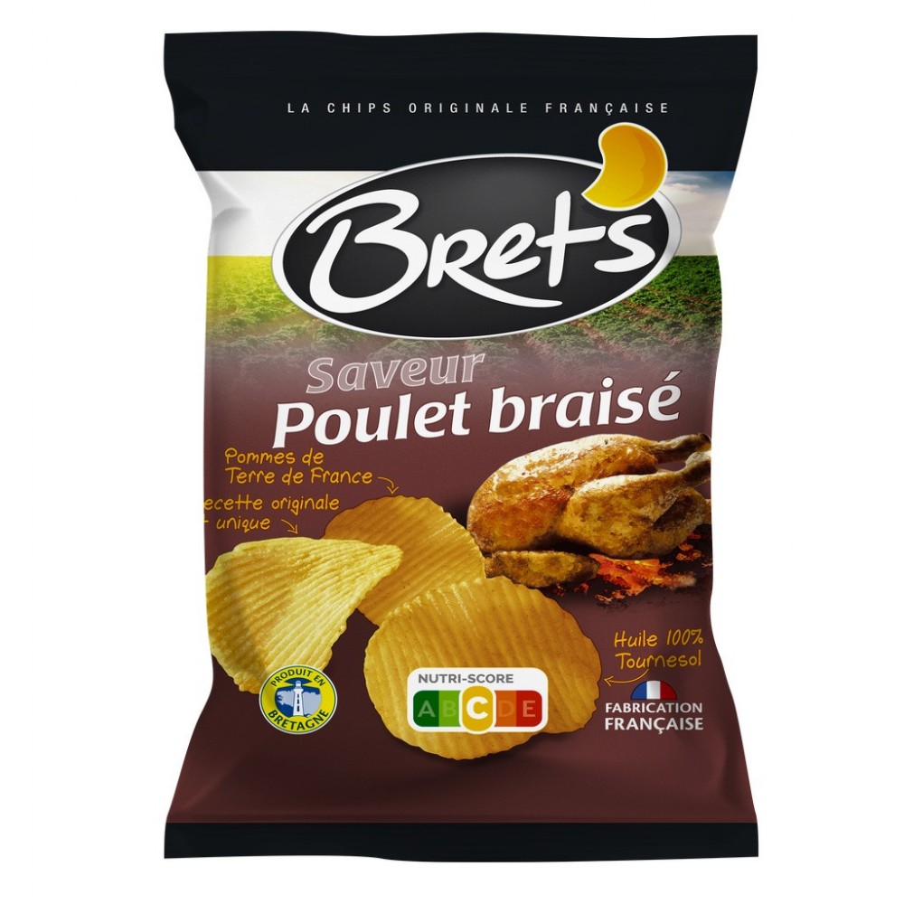Notre bestseller au goût inimitable de poulet rôti du week-end ! La super craquante poulet braisé évoque ces bons moments de dégustation et de convivialité autour d'un feu de bois ou d'un barbecue. / Bret's: la qualité en toute simplicité : Des pommes de terre françaises, une cuisson à l'huile de tournesol, une pincée de sel, des goûts justes et authentiques et c'est tout ! / Bret's : un engagement citoyen. Nous sommes une entreprise familiale impliquée dans le développement économique de notre région. / Merci à nos agriculteurs : 265 agriculteurs bretons s'engagent avec Bret's pour la qualité de nos pommes de terre et la réduction des traitements dans les champs. / Bret's préserve l'environnement : Grâce à une gestion de l'eau et des approvisionnements locaux, nous agissons au quotidien pour améliorer notre bilan carbone. / Produit en Bretagne / Fabrication française