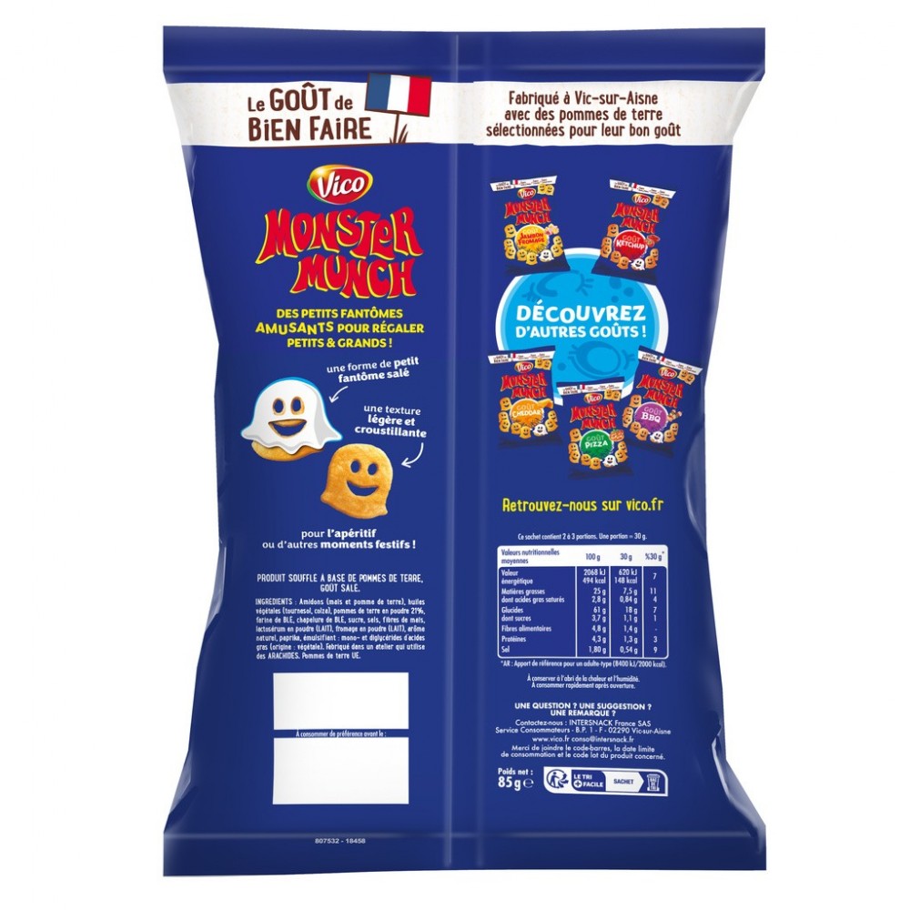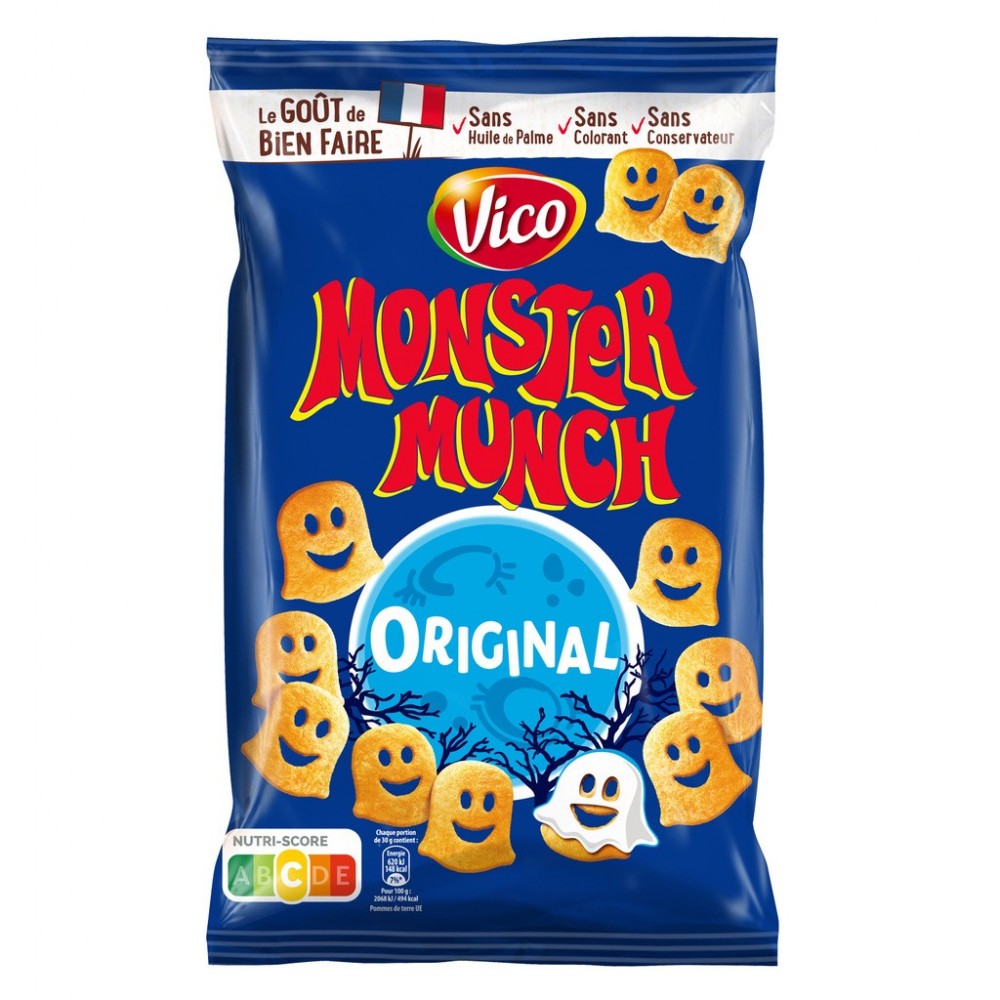 Petits monstres salés au bon goût de pomme de terre . D'une texture légère et croustillante, les Monster Munch peuvent être dégustés en différentes occasions. A l'apéritif en compagnie des parents ou lors d'un petit creux après le sport, ils seront aussi appréciés comme accompagnement en complément d'un repas équilibré.