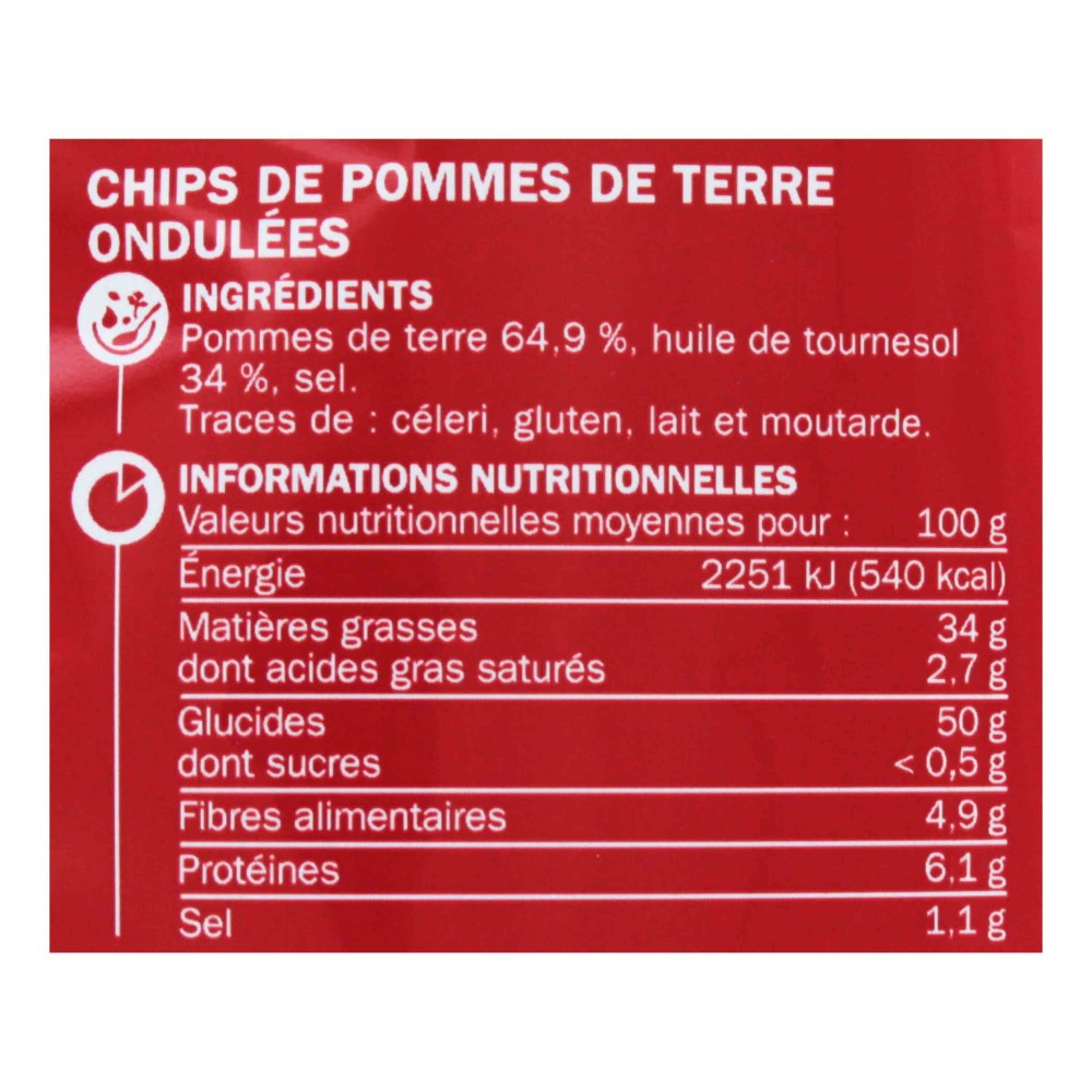 Ingrédients: Pommes de terre 64,9 %, huile de tournesol 34 %, sel.