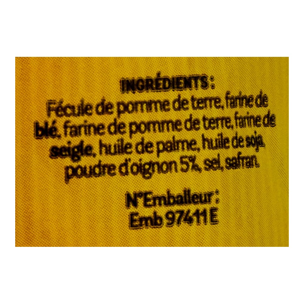 fécule de pomme de terre ,farine de blé,farine de pomme de terre,farine de seigle,huile de palme,huile de soja,poudre d'oignon5%,sel,safran
